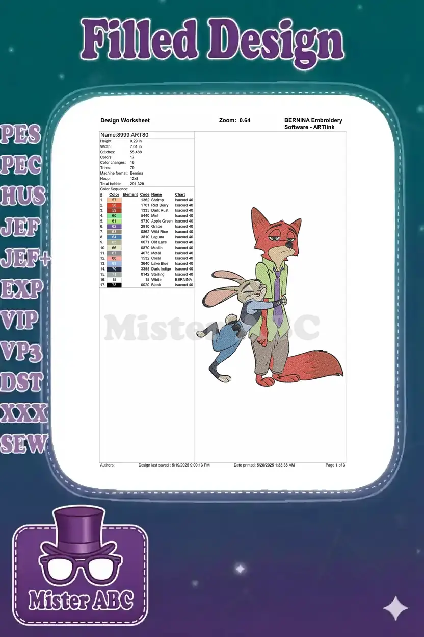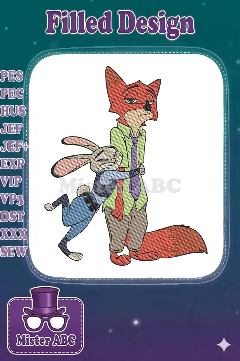 A delightful embroidery design capturing the playful dynamic between Nick Wilde and Judy Hopps from Zootopia.