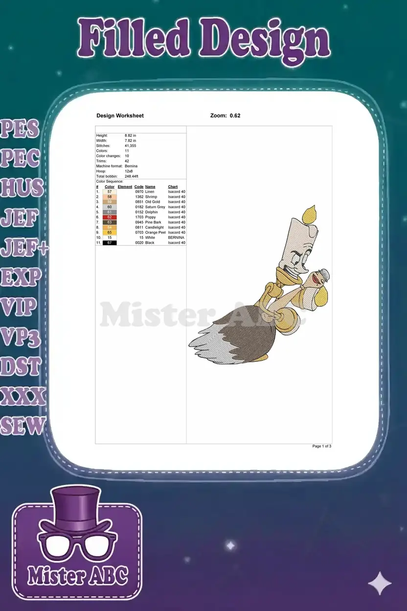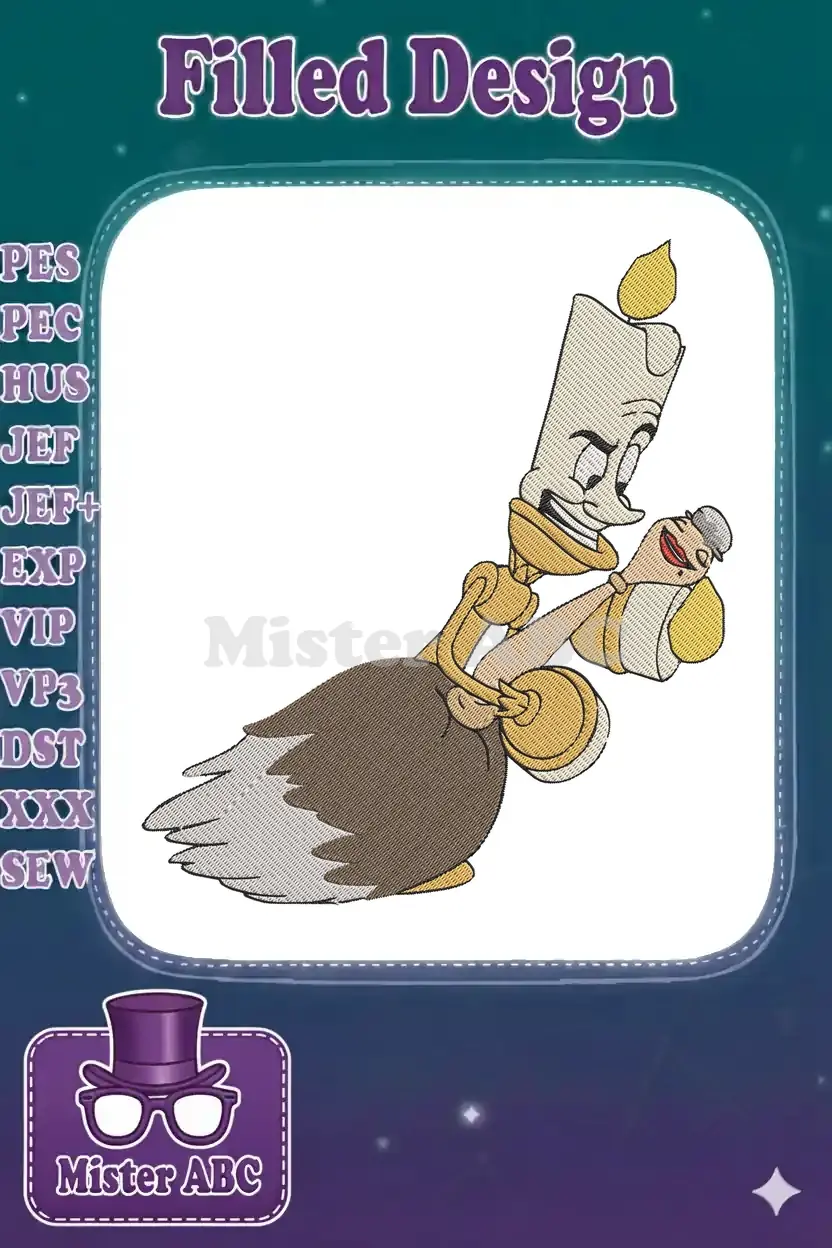 Happy Lumiere candlestick and feather duster character embroidery designs