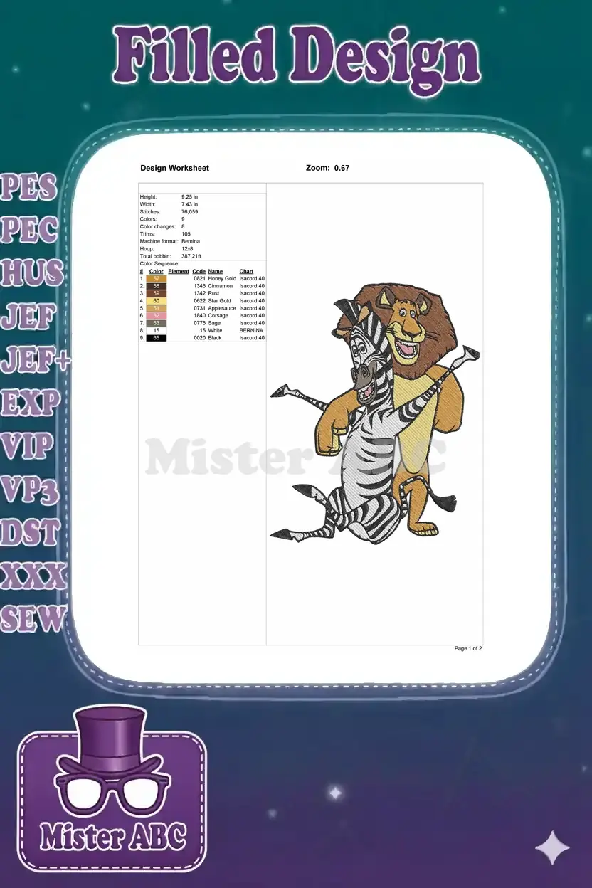 Embrace the wild fun with Alex and Marty from Madagascar in this lively embroidery design! Perfect for fans.