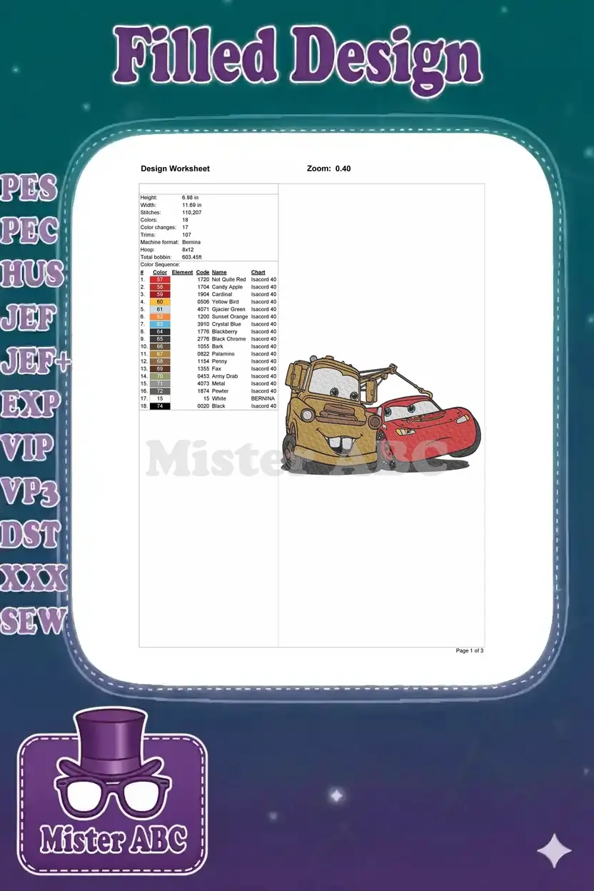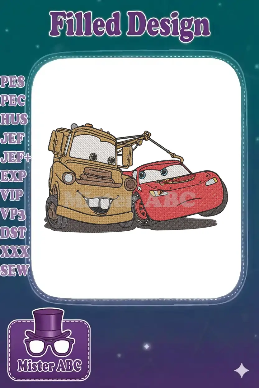 Embroider the iconic friendship of Mater and Lightning McQueen! A delightful design for fans of adventure.