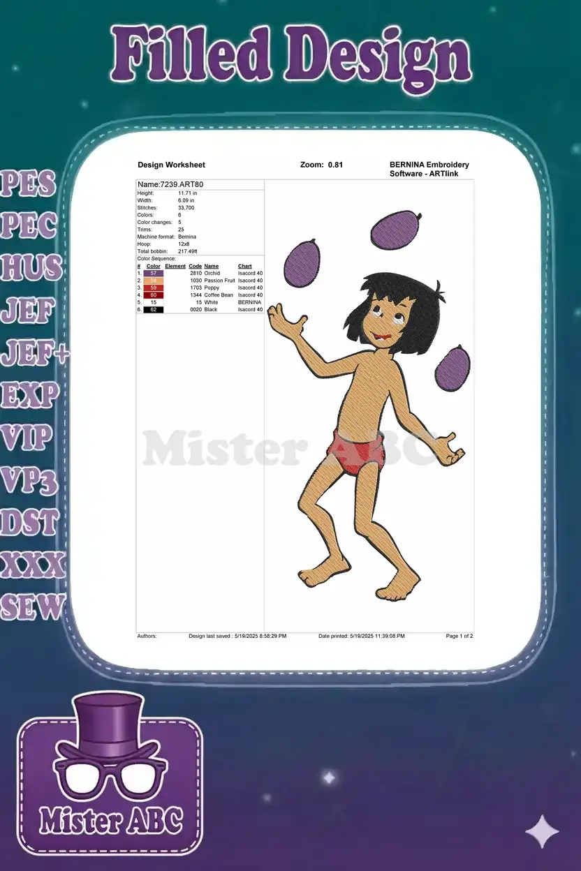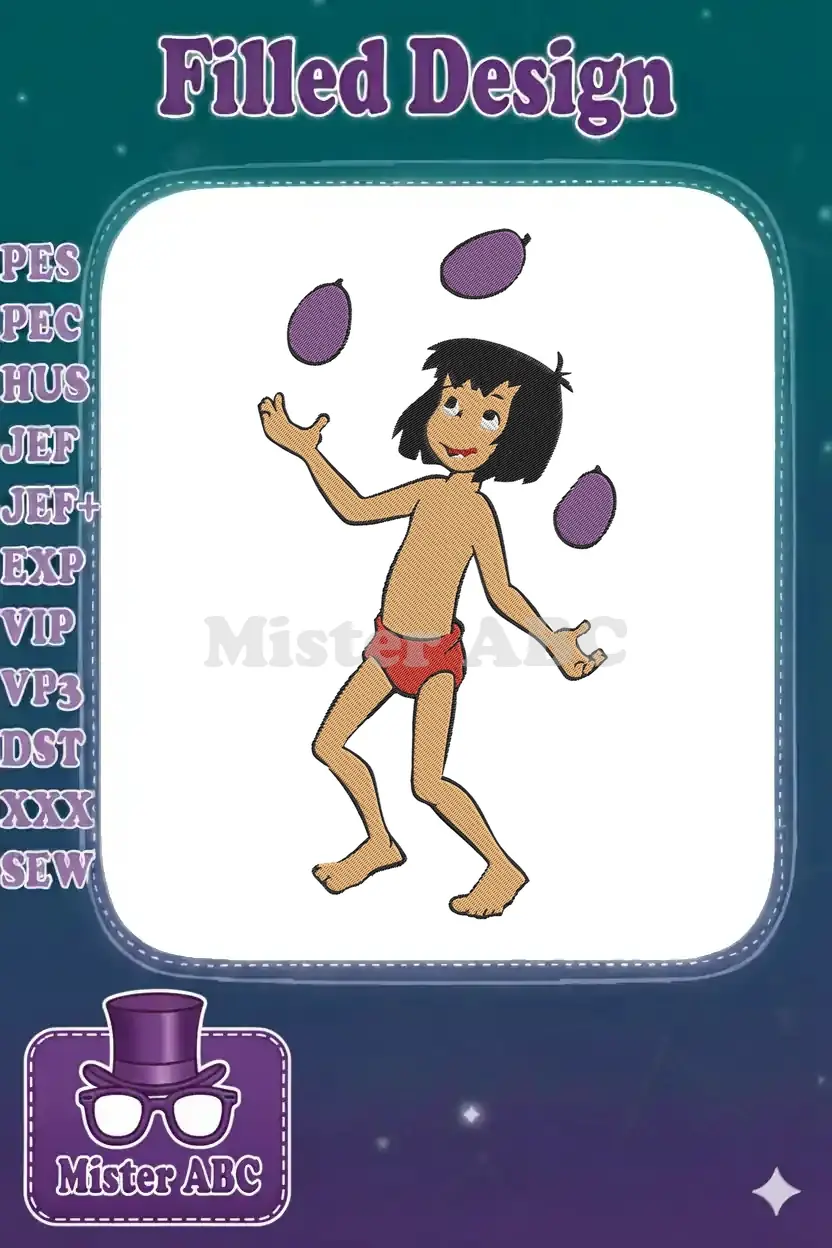 Happy Mowgli juggling purple jungle fruits playful cartoon embroidery designs