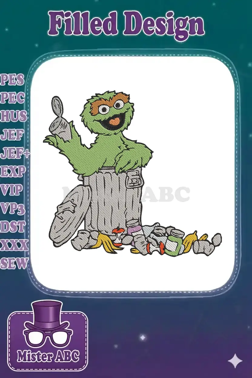 Happy Oscar the Grouch with Trash Can Embroidery Designs