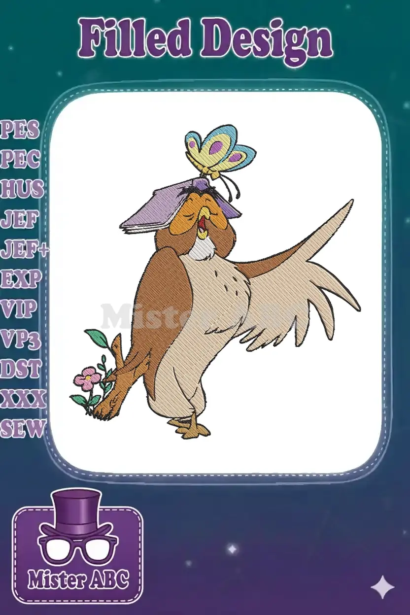Happy Owl with Butterfly and Flower Woodland Embroidery Designs