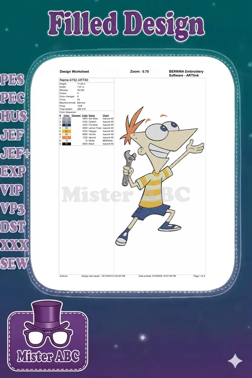 Happy Phineas cartoon boy holding wrench embroidery designs