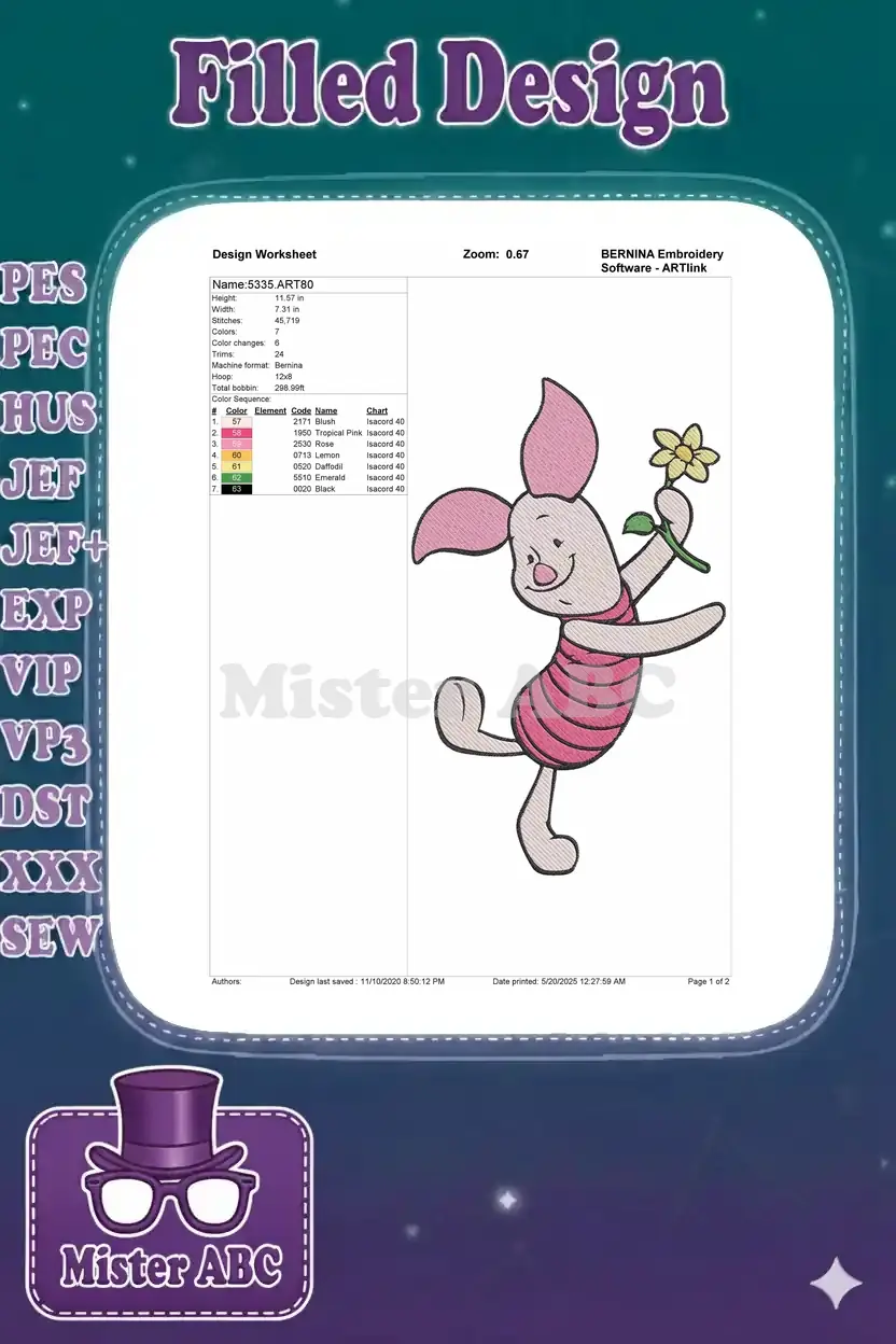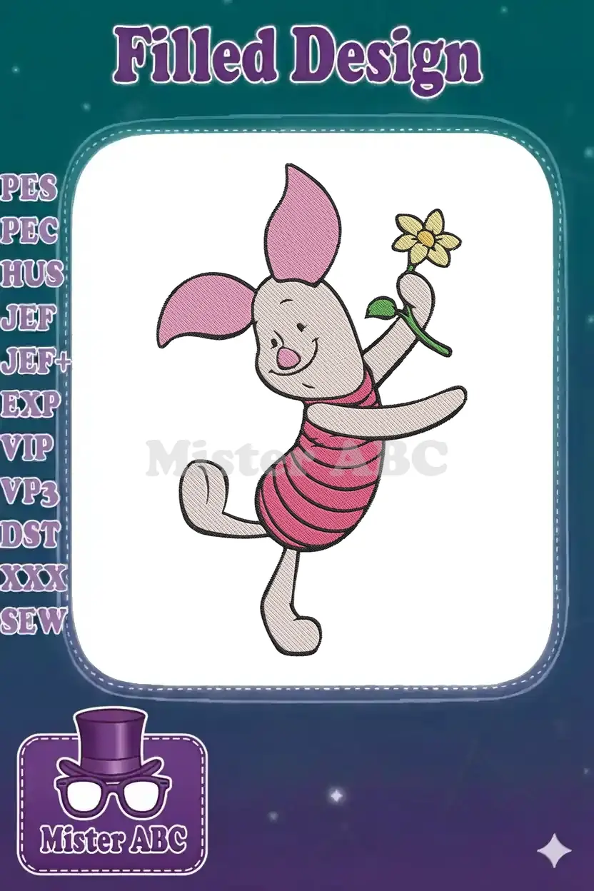Happy Piglet holding yellow flower Winnie Pooh embroidery designs