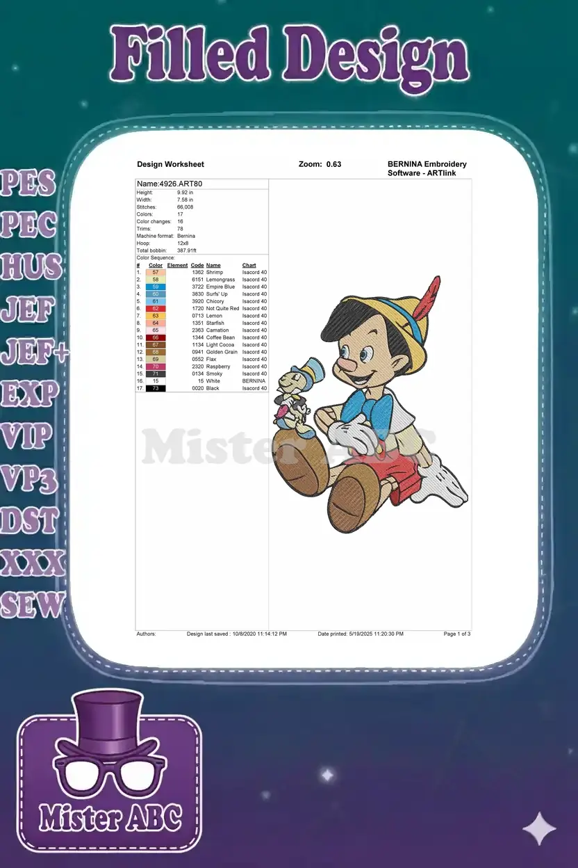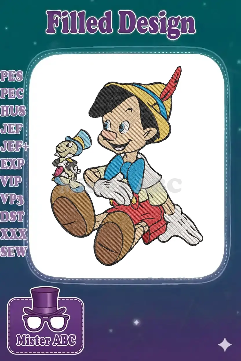 Happy Pinocchio and Jiminy Cricket animated kids embroidery designs