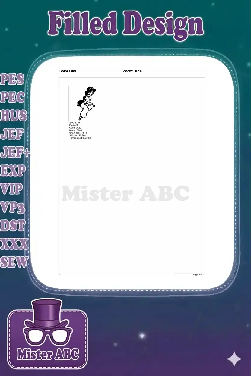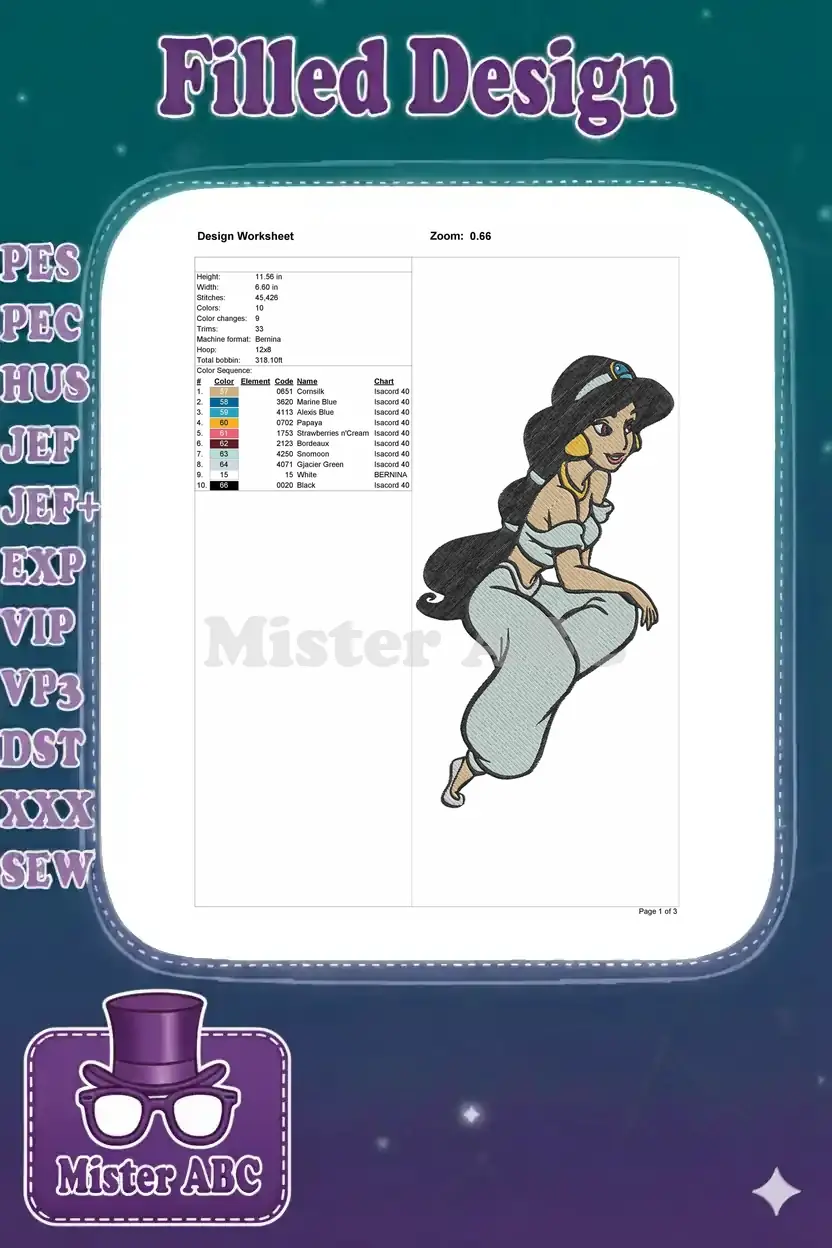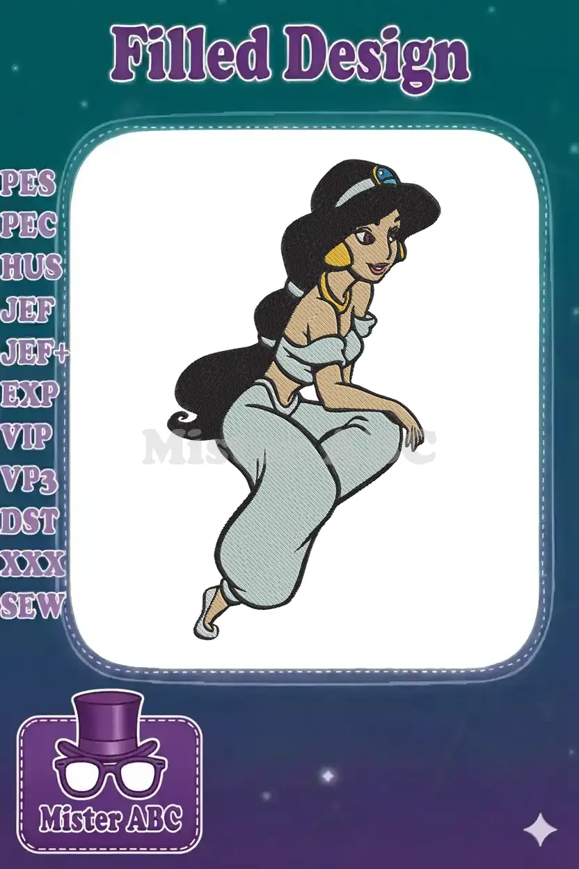 Embrace the magic with this vibrant Princess Jasmine embroidery design, perfect for adding royal charm to any project.