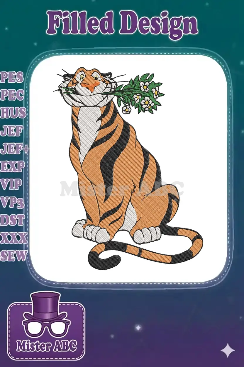 Happy Shere Khan tiger holding white flowers cartoon embroidery designs