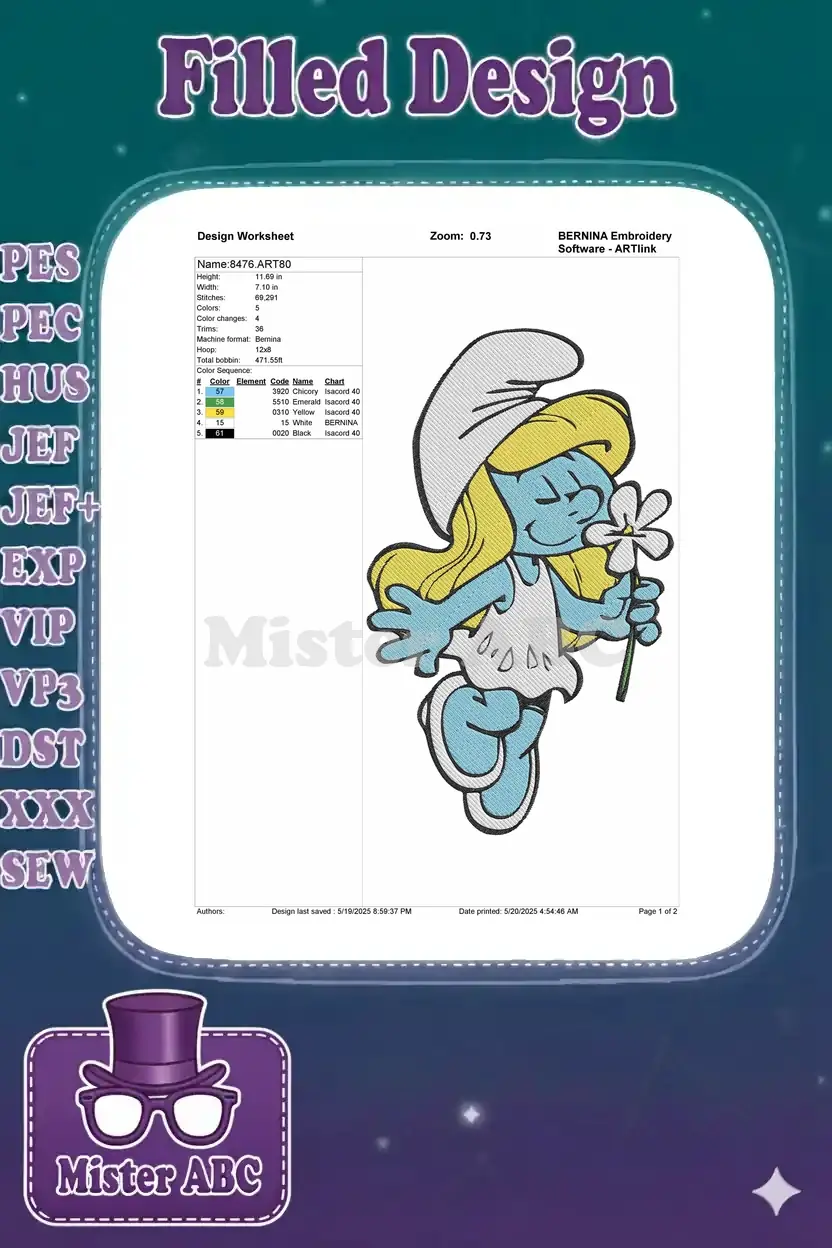 Happy Smurfette with Flower Cartoon Character Embroidery Designs