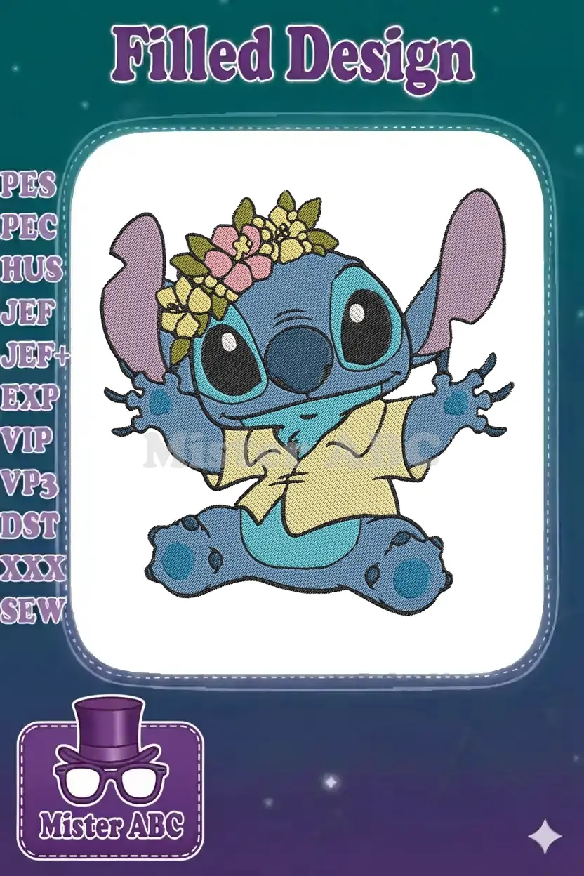 Embrace tropical vibes with this delightful Stitch embroidery design, featuring him in a charming Hawaiian shirt and lei. Perfect for adding a touch of aloha to any project.
