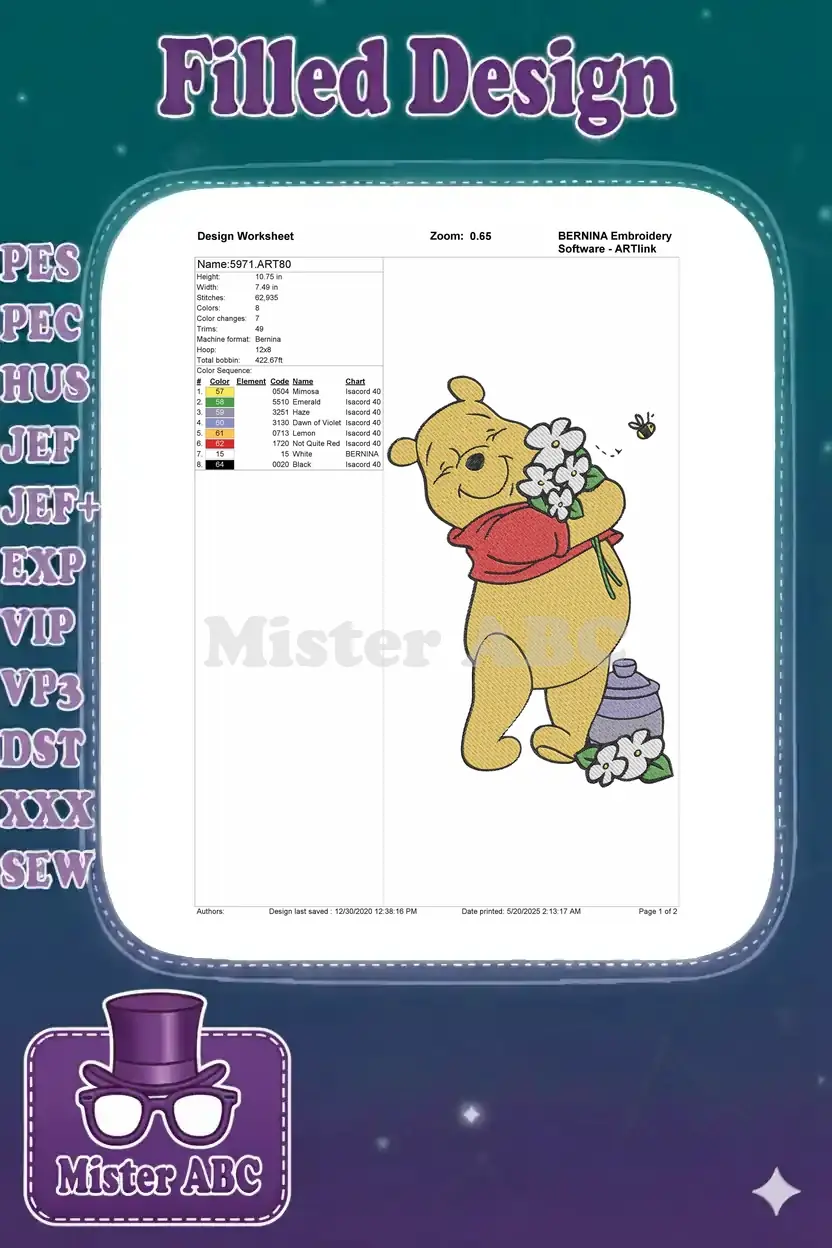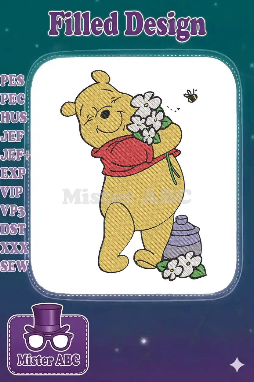 Happy Winnie Pooh holding flowers bee and honey pot embroidery designs