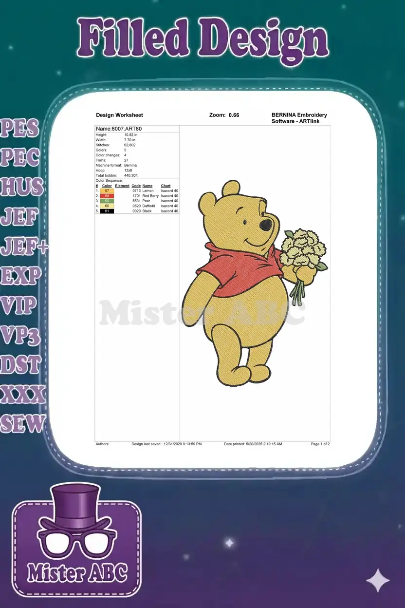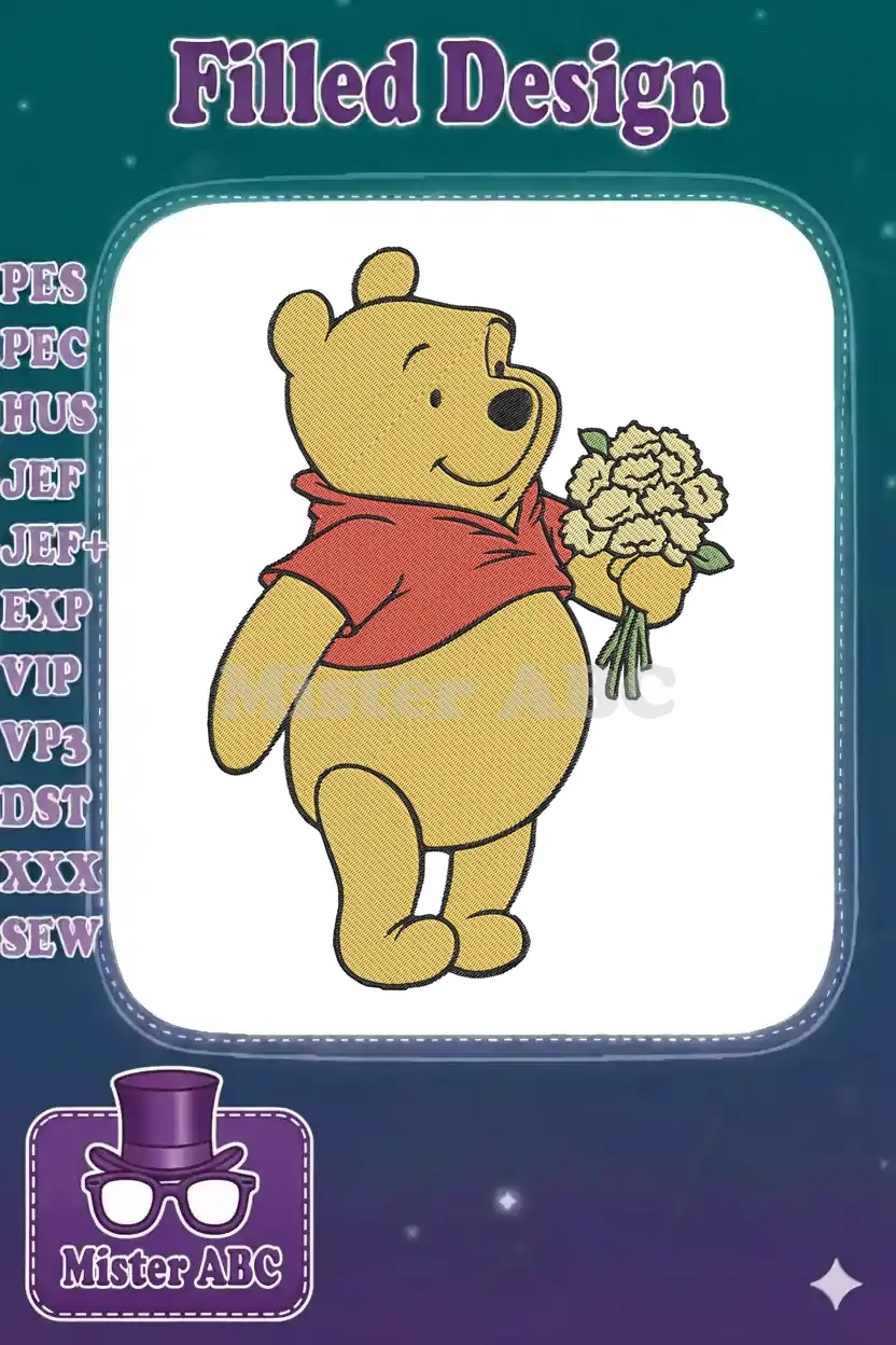 Happy Winnie the Pooh holding yellow flowers embroidery designs