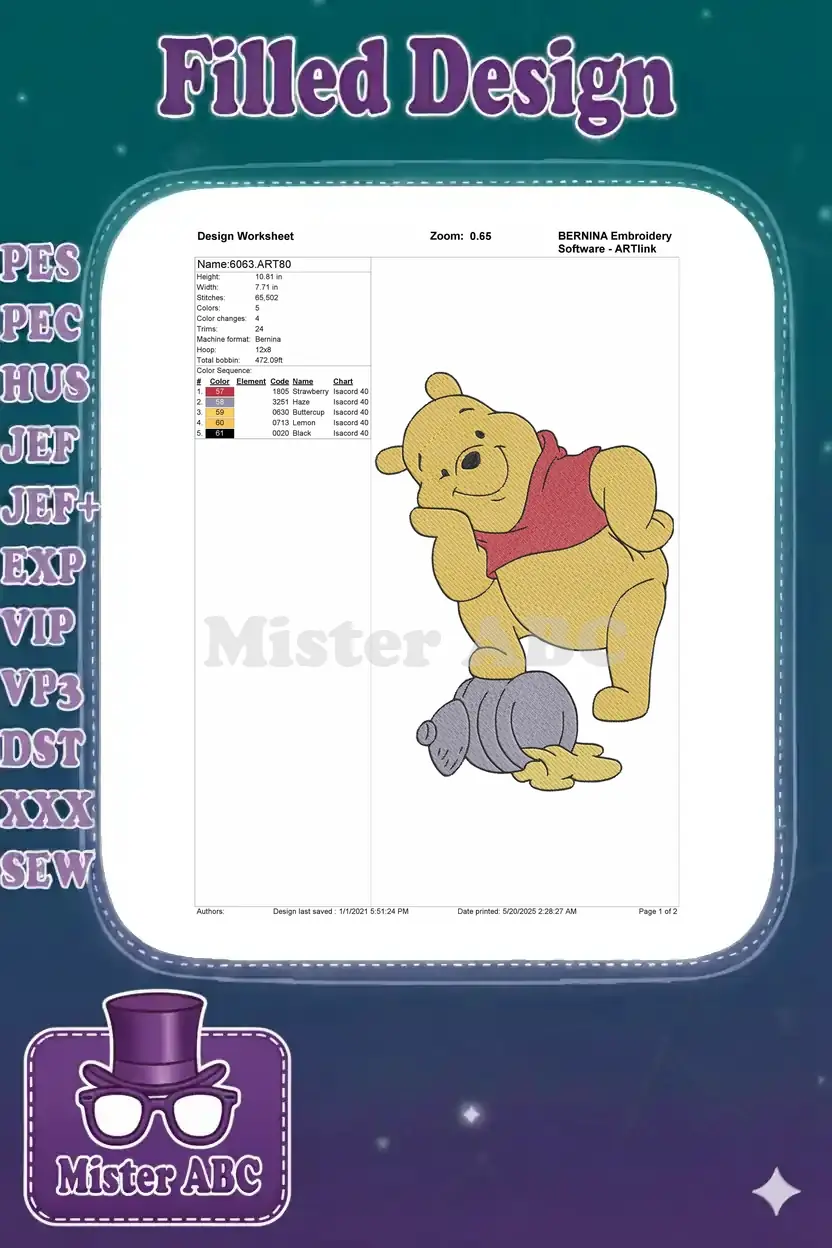 A delightful Winnie the Pooh embroidery design featuring him with a spilled honey pot, perfect for adding charm.