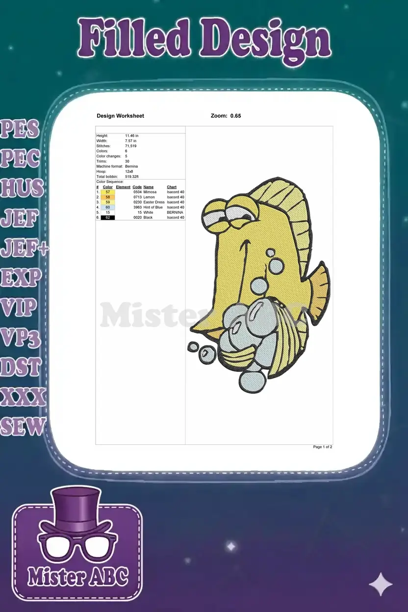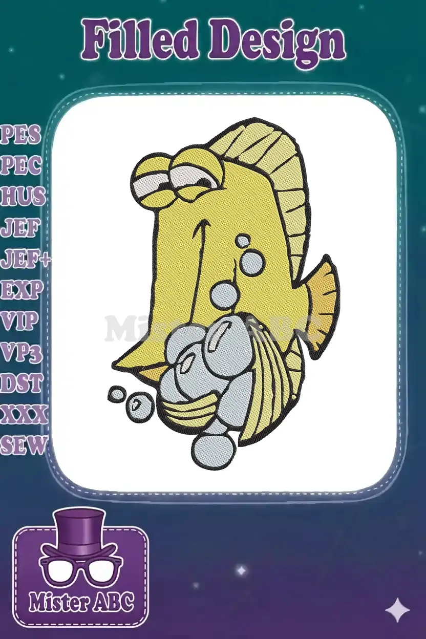 A delightful embroidery design featuring a cheerful yellow fish lovingly clutching a seashell, surrounded by bubbles. Perfect for adding a touch of whimsical charm to any project.