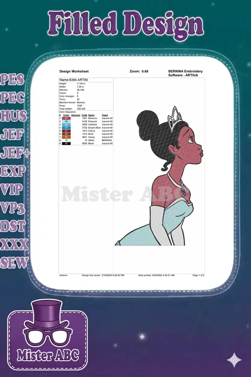 Hopeful Princess Tiana wearing crown and blue dress embroidery designs