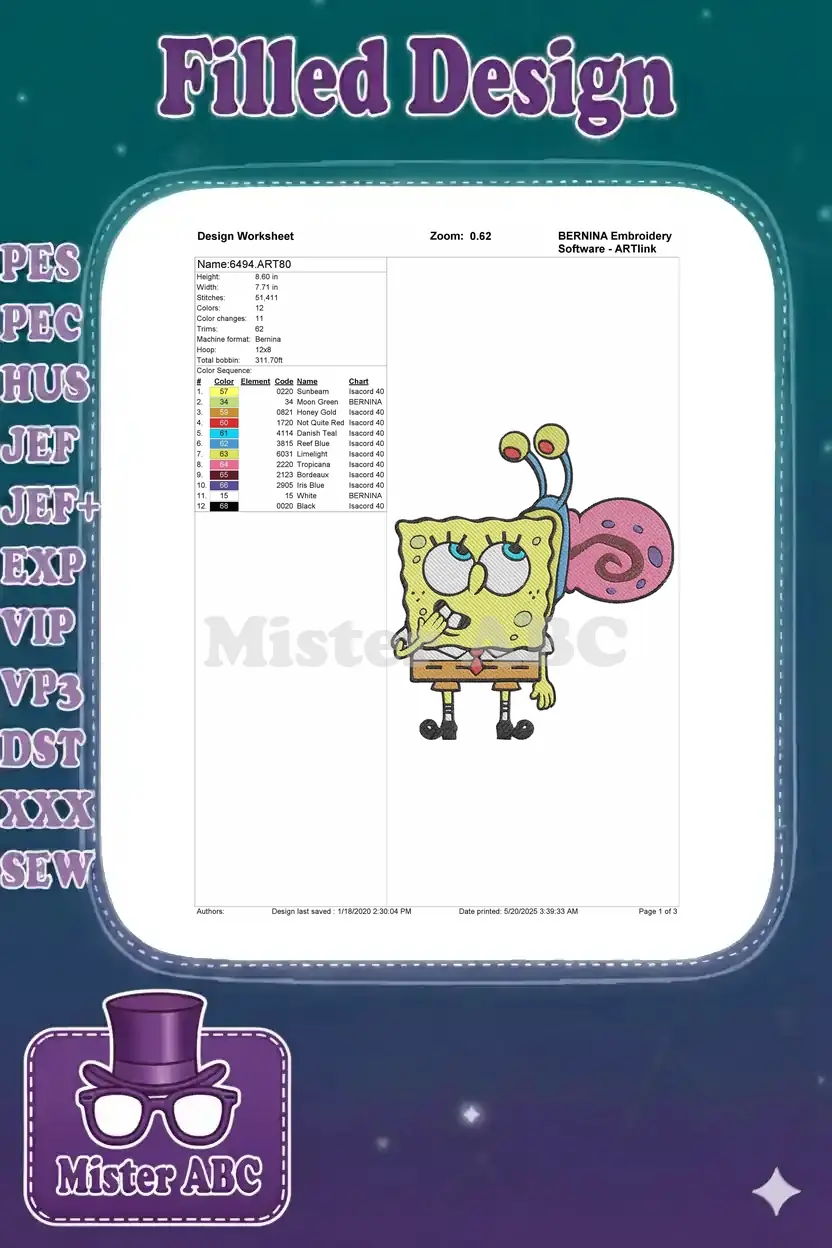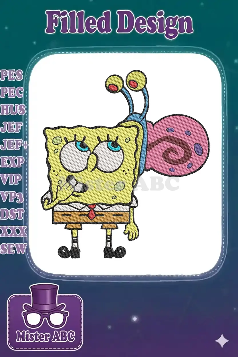 Humorous SpongeBob SquarePants with Gary Snail shell antenna embroidery designs