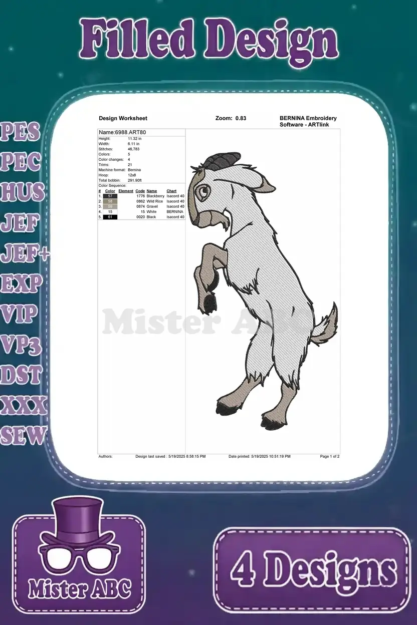 Discover a charming bundle of 4 filled embroidery designs featuring playful goats in various dynamic poses. Perfect for adding a whimsical touch to any project.