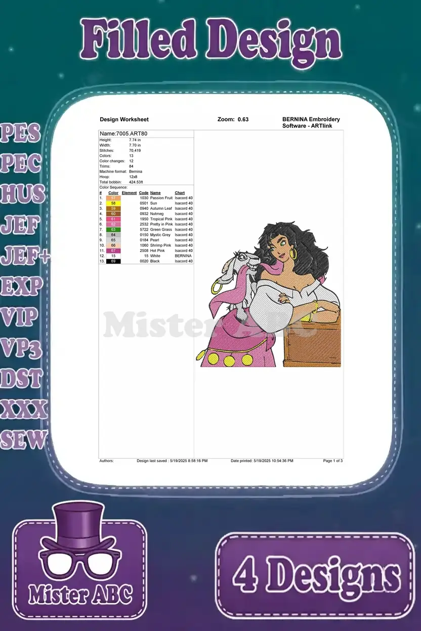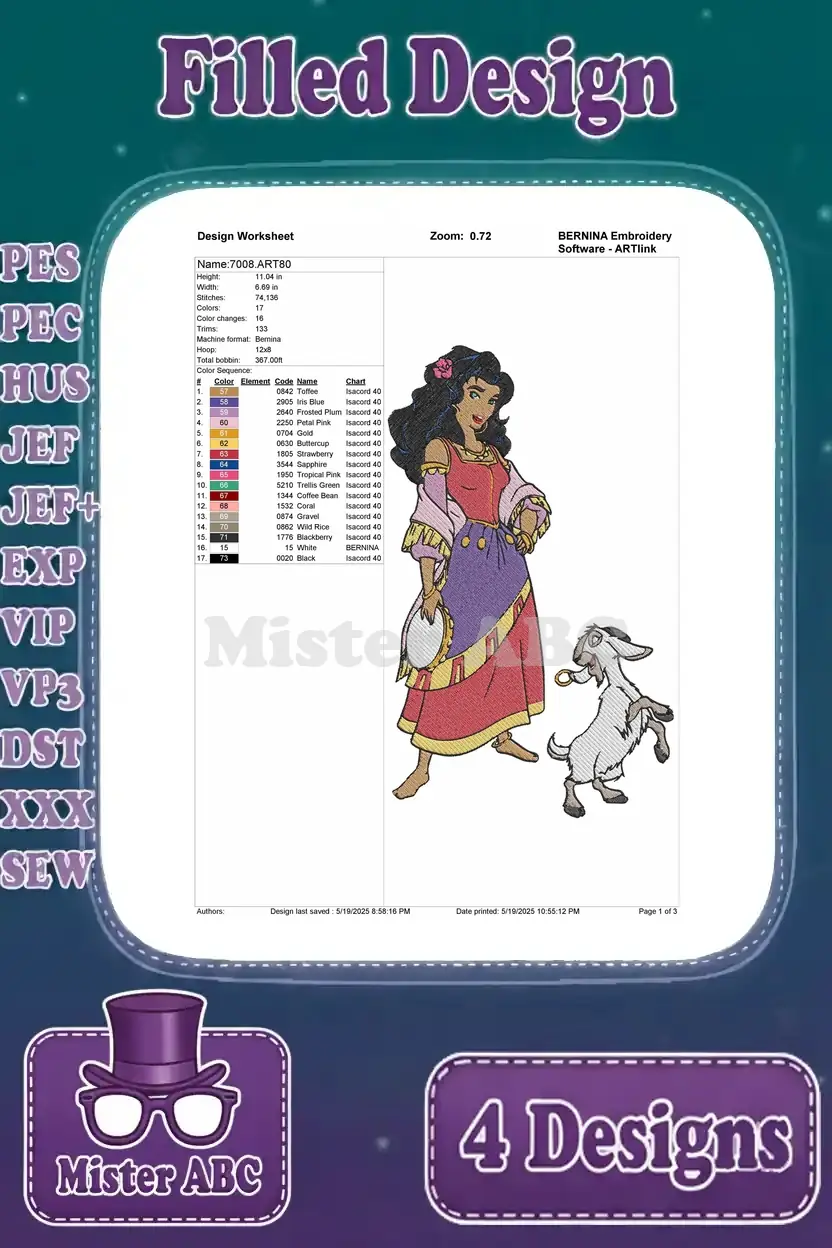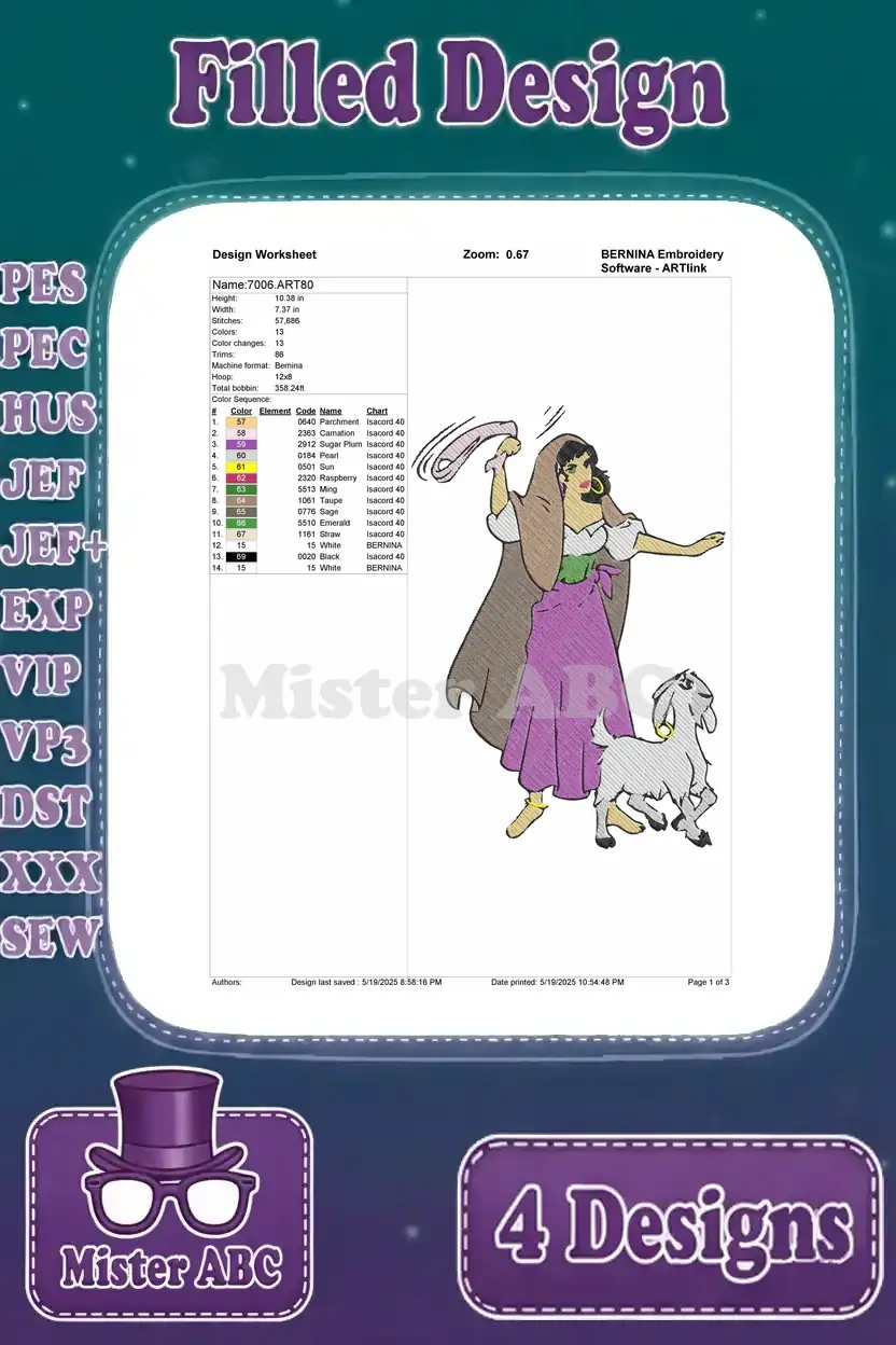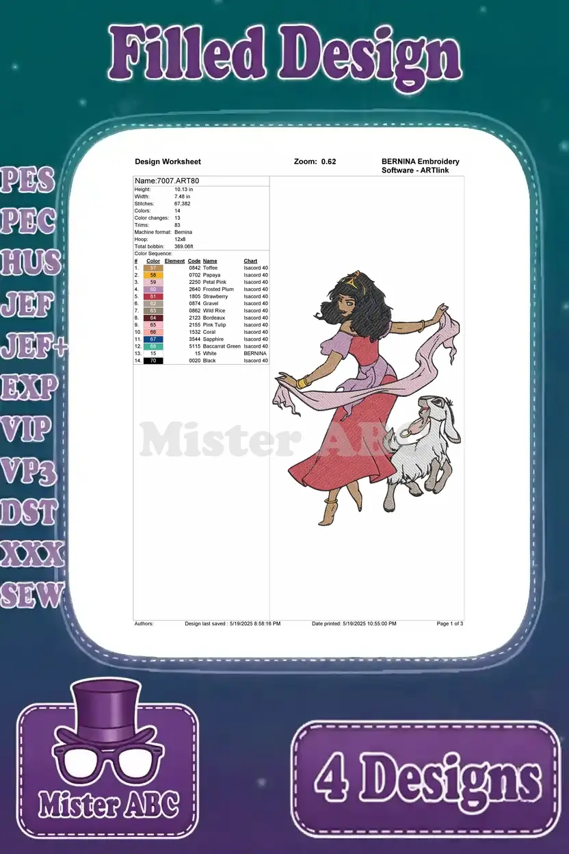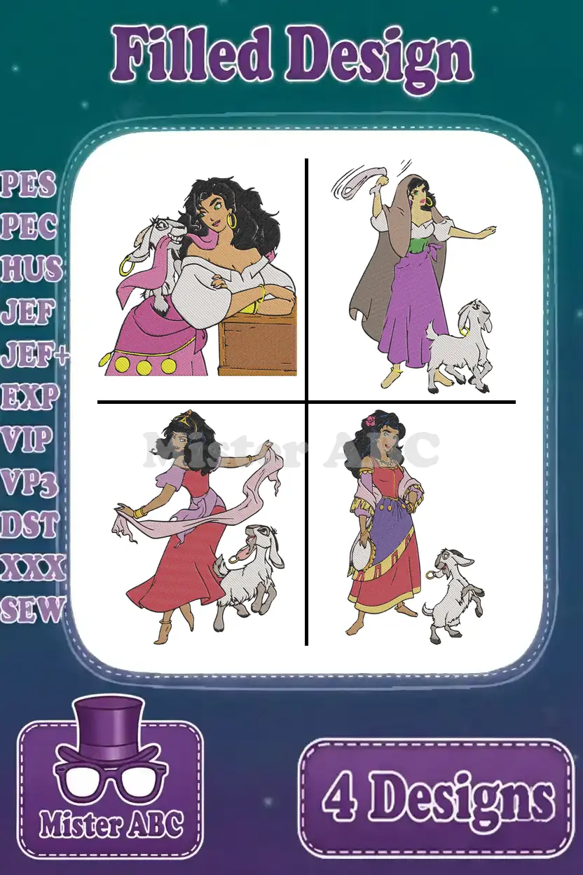 Hunchback Of Notre Dame Esmeralda With Djali Goat Dancing And At Feast Of Fools – Filled Embroidery Design