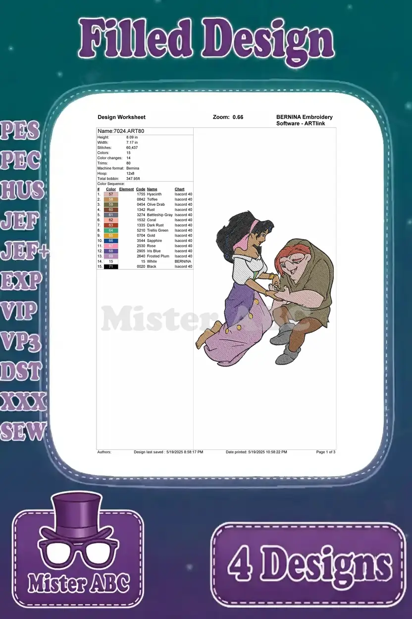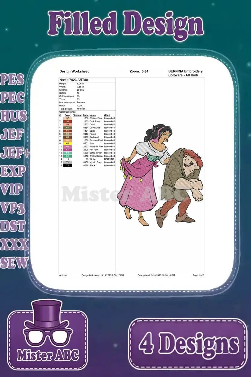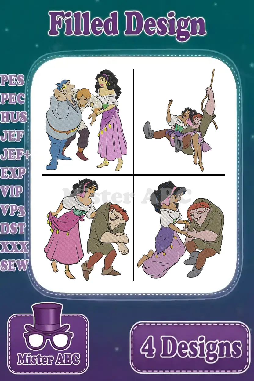Hunchback Of Notre Dame Esmeralda And Quasimodo Tender Friendship Moments Poses – Filled Embroidery Design