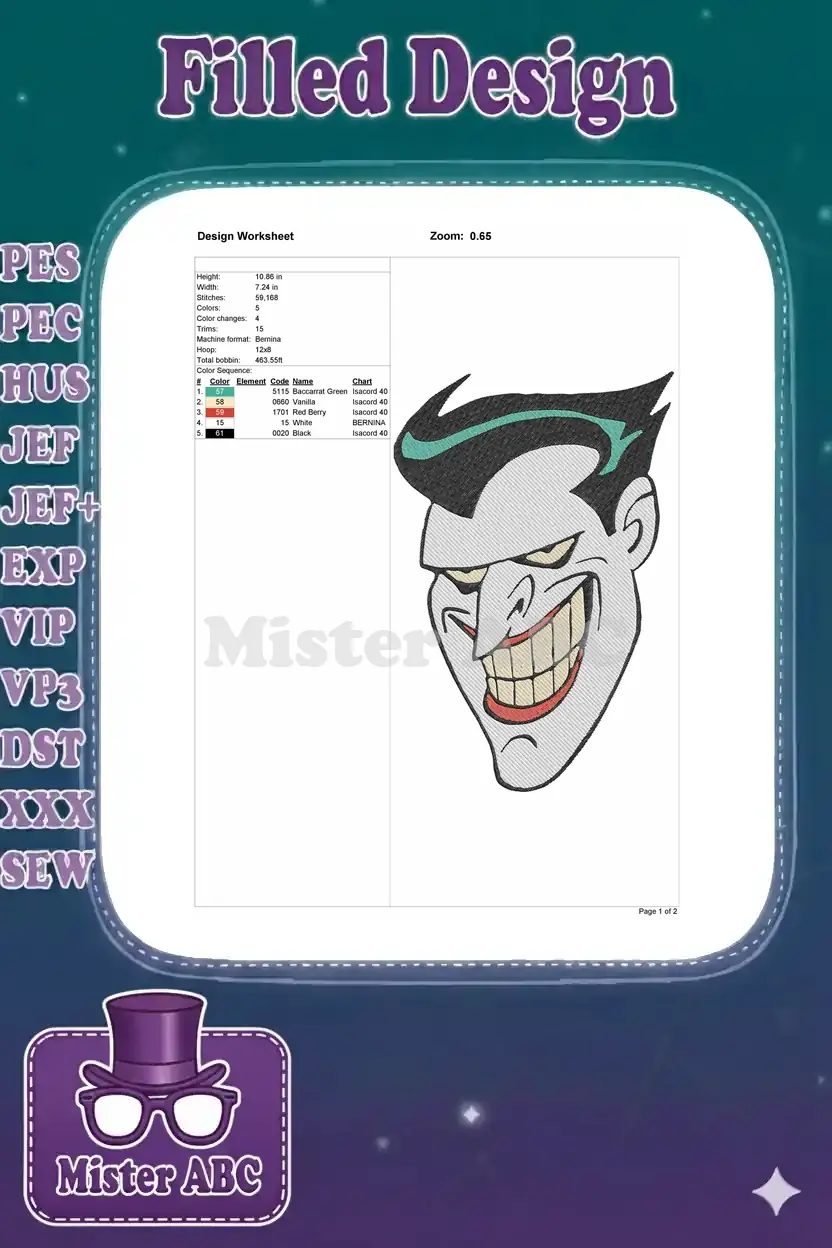 Iconic Joker villain animated face embroidery designs