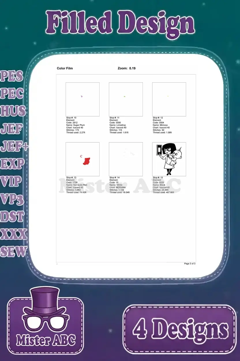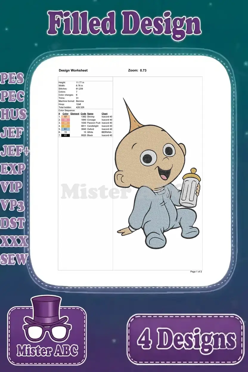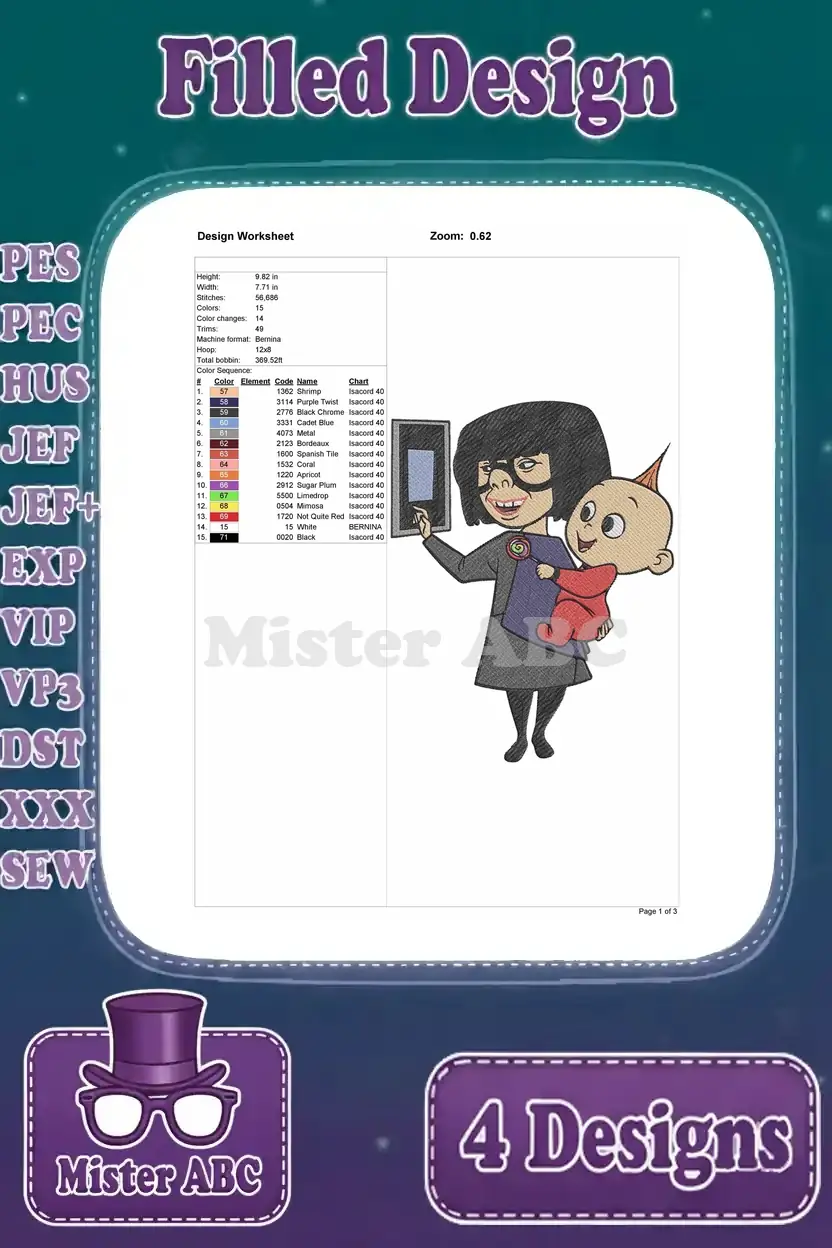 Discover amazing filled embroidery designs featuring Jack-Jack, Edna Mode, and Frozone from The Incredibles. Perfect for fans!