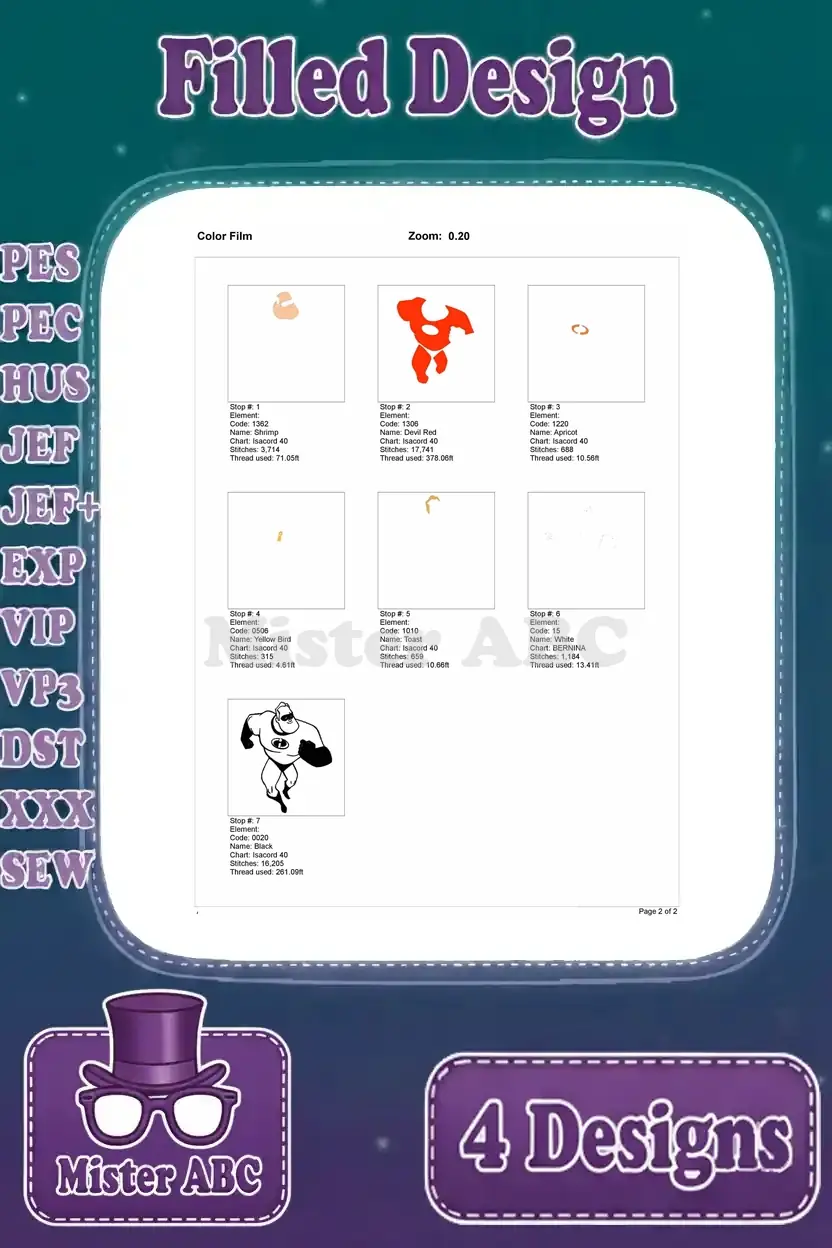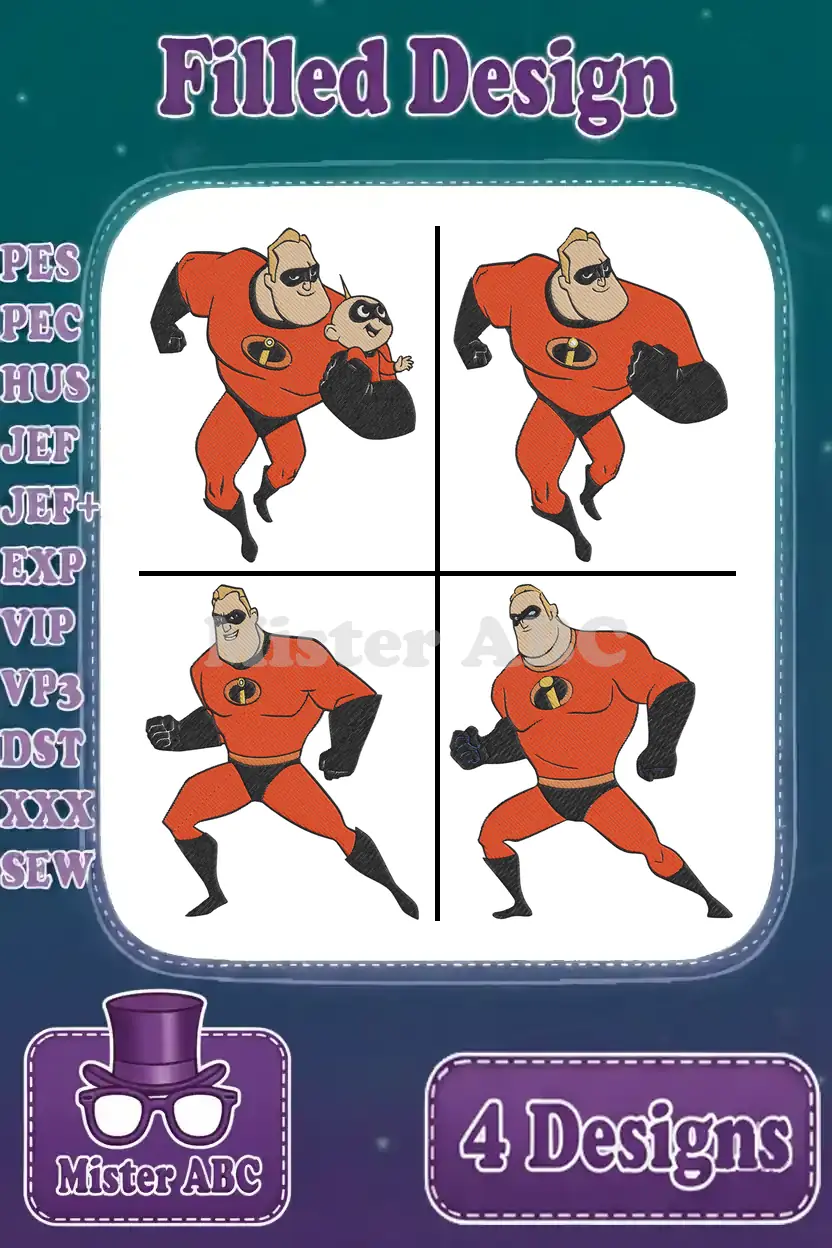 The Incredibles – Mr Incredible Bob Parr – Superhero Strongman Poses – Disney Pixar Character – Filled Embroidery Design