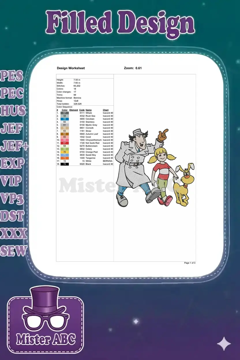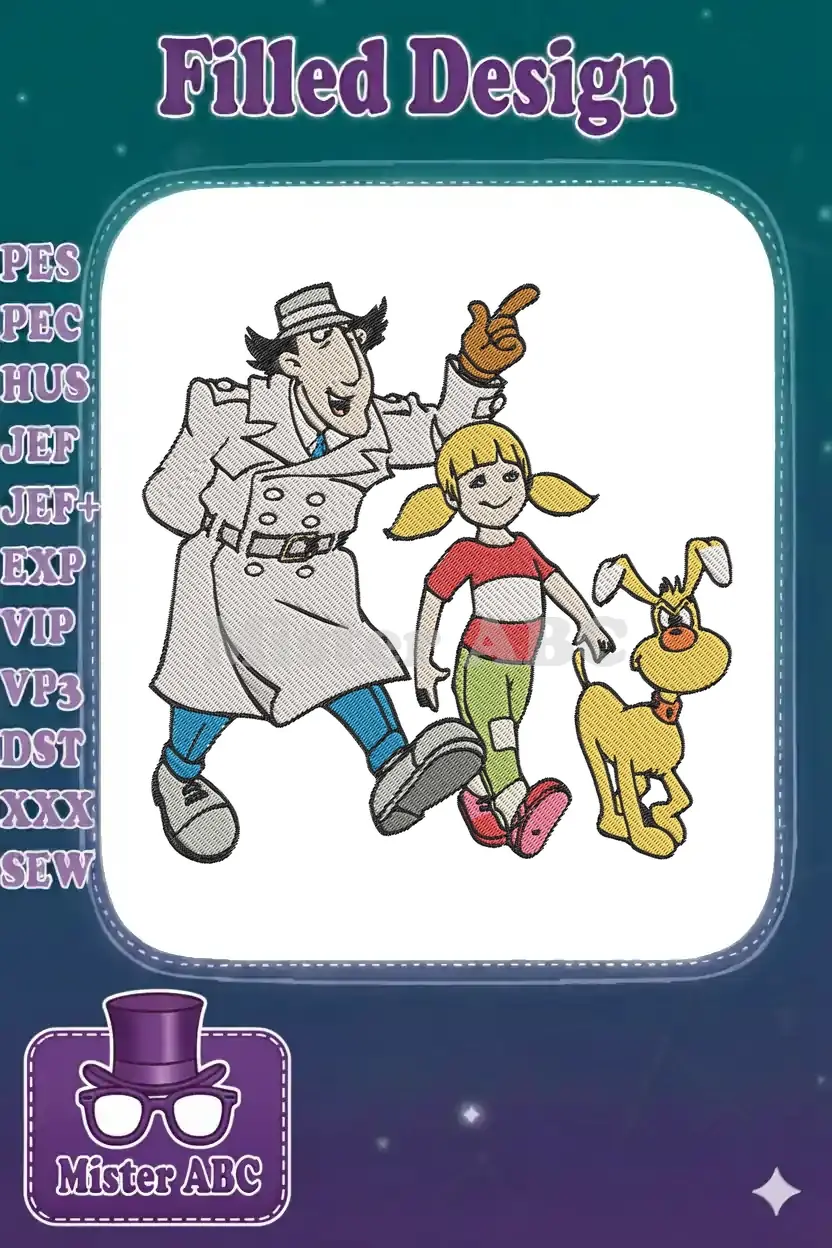 Embark on an adventure with this vibrant embroidery design featuring Inspector Gadget, Penny, and Brain. Perfect for fans!