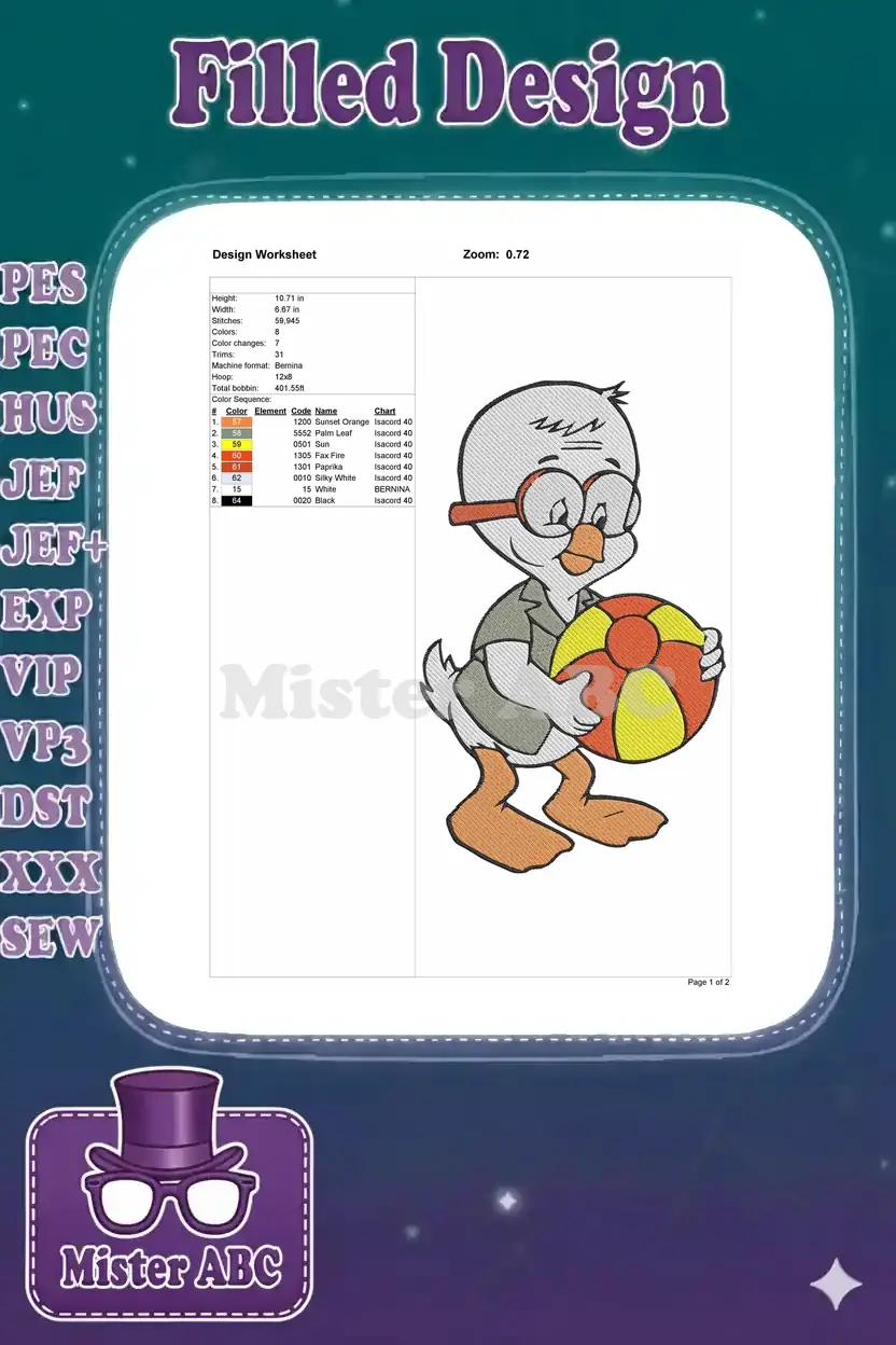 Intellectual Cartoon Duck with Beach Ball Summer Fun Embroidery Designs