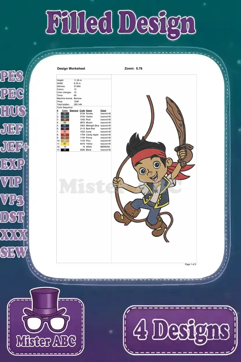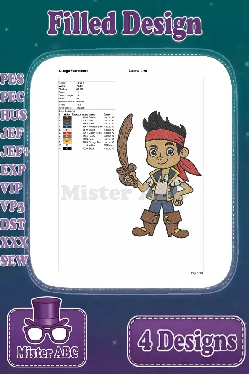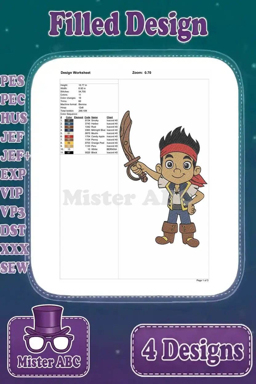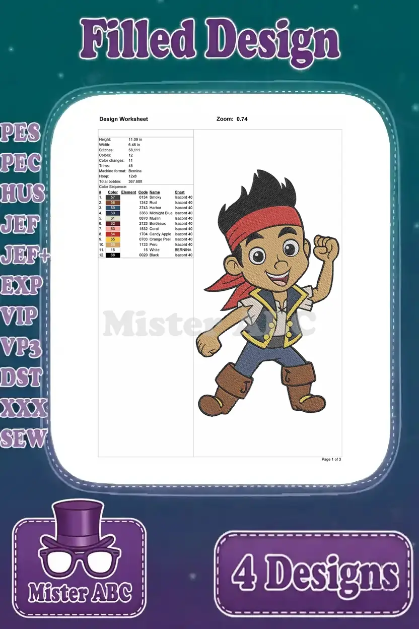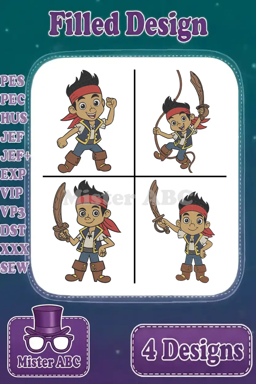 Jake And The Never Land Pirates Jake Various Action Poses With Sword Spyglass – Filled Embroidery Design