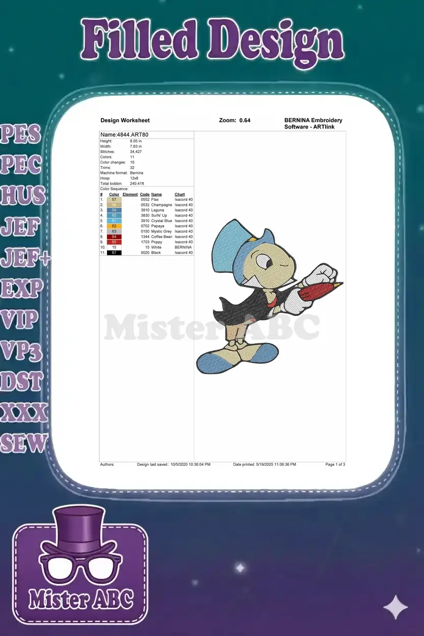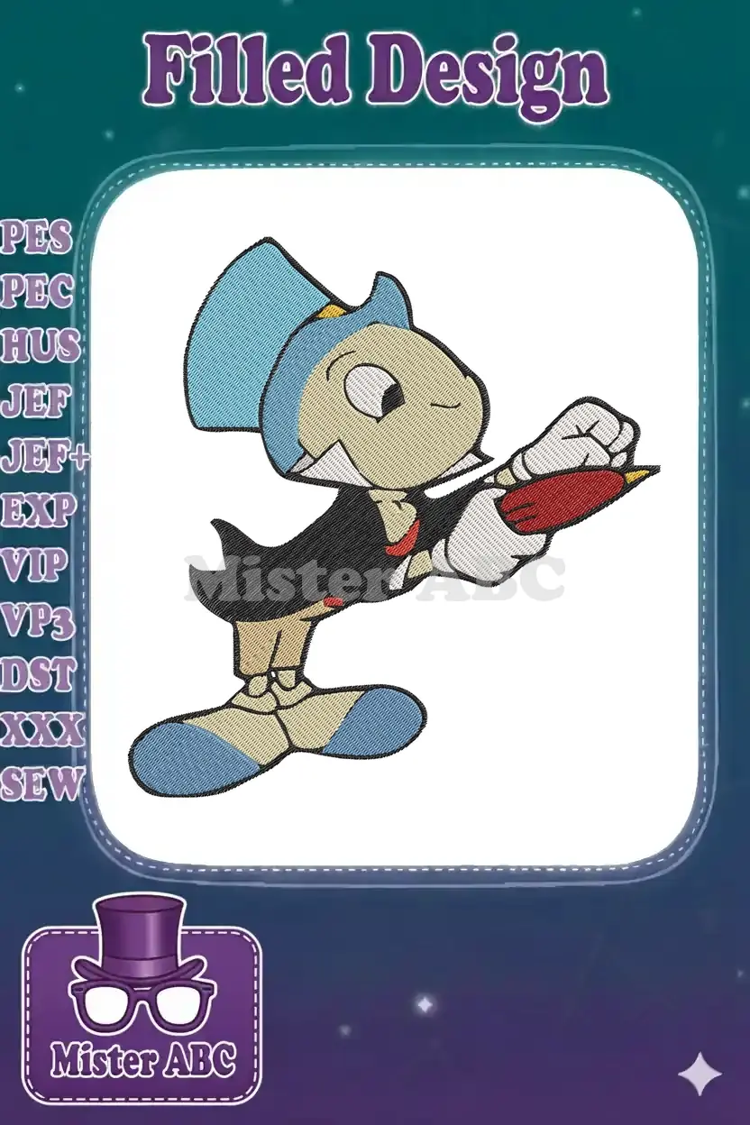 Jiminy Cricket Flying with Red Umbrella Cartoon Embroidery Designs