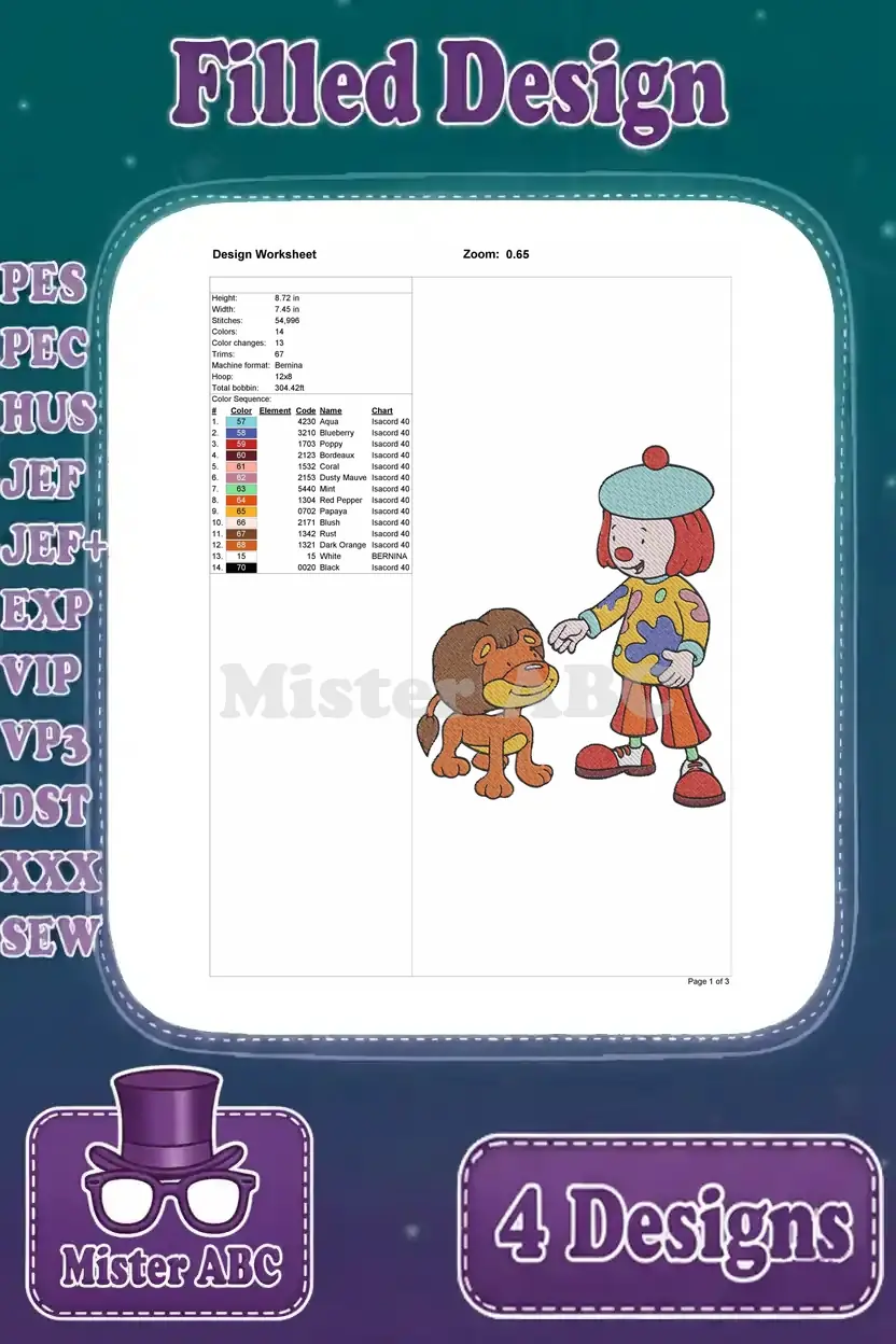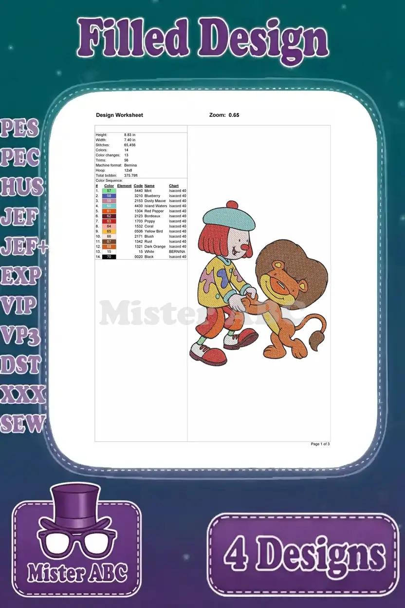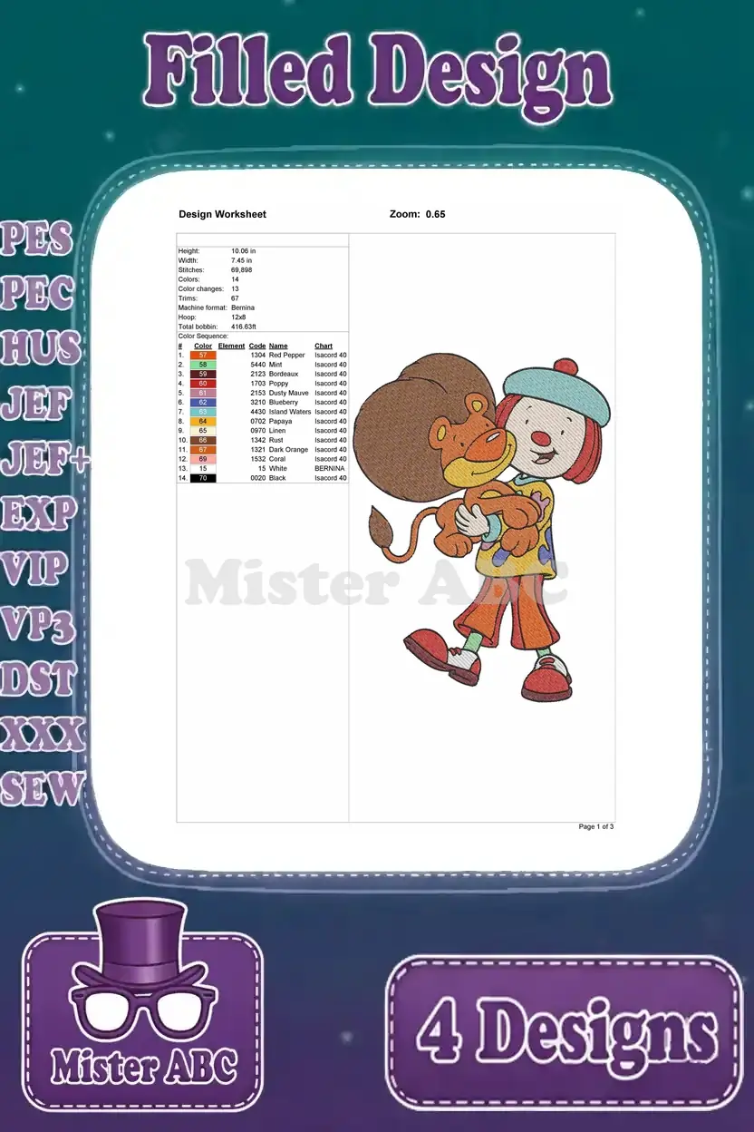 Jojos Circus Jojo Tickle Clown And Goliath The Lion Interactive Friendship Poses - Filled Embroidery Design - 3468