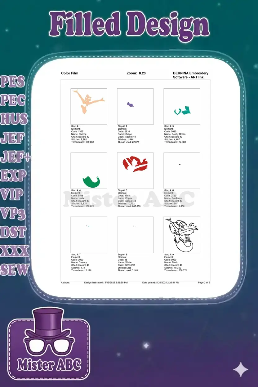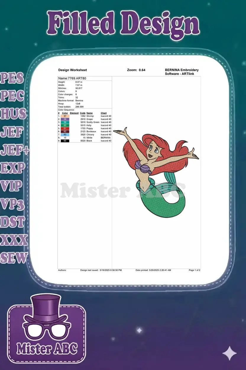 Dive into a magical underwater world with this vibrant Ariel embroidery design. Perfect for enchanting projects and fans!