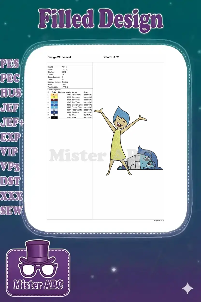 Celebrate every emotion with this vibrant embroidery design featuring Joy’s exuberance and Sadness’s gentle presence. Perfect for adding a touch of Pixar magic to any project.