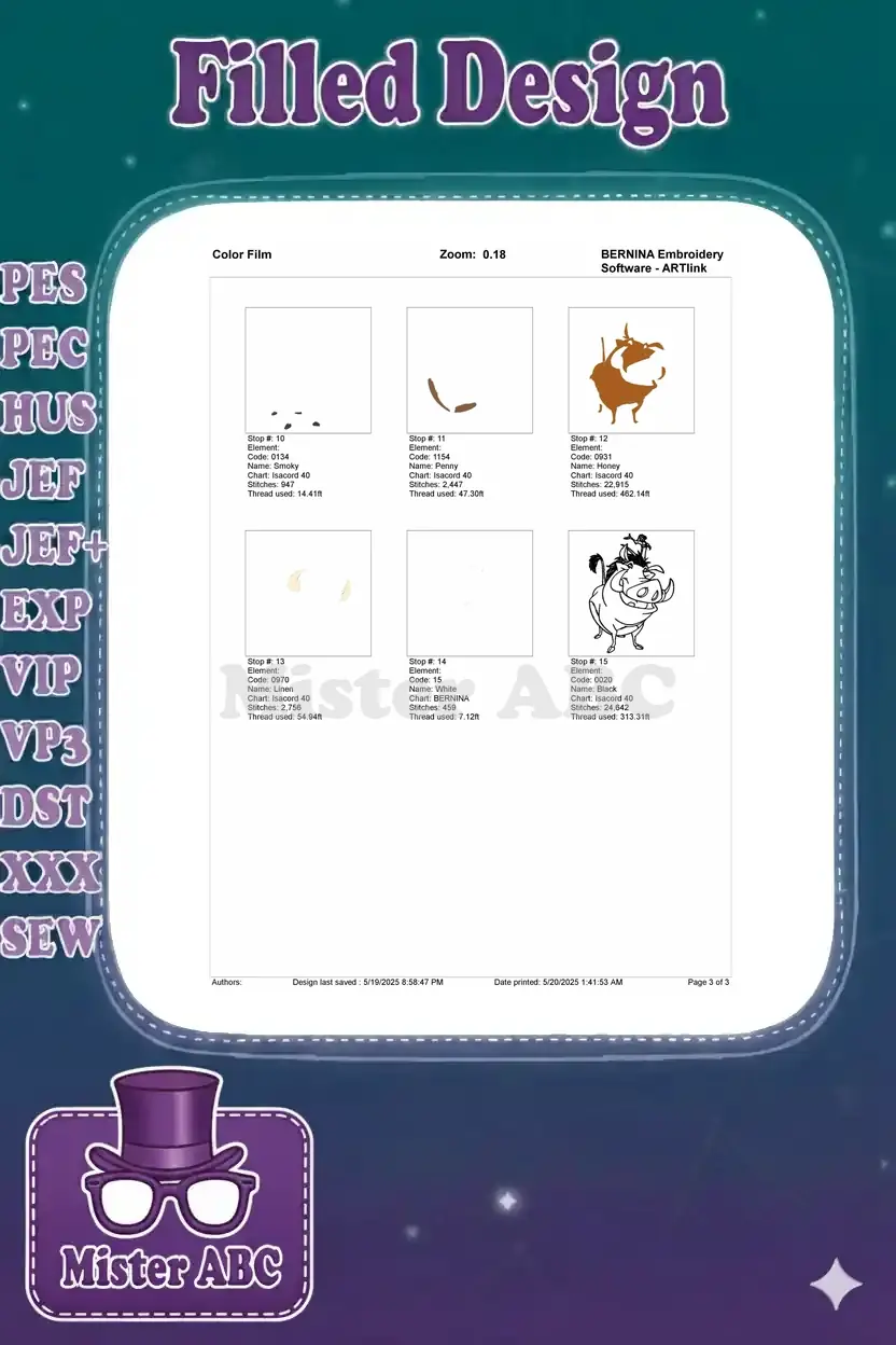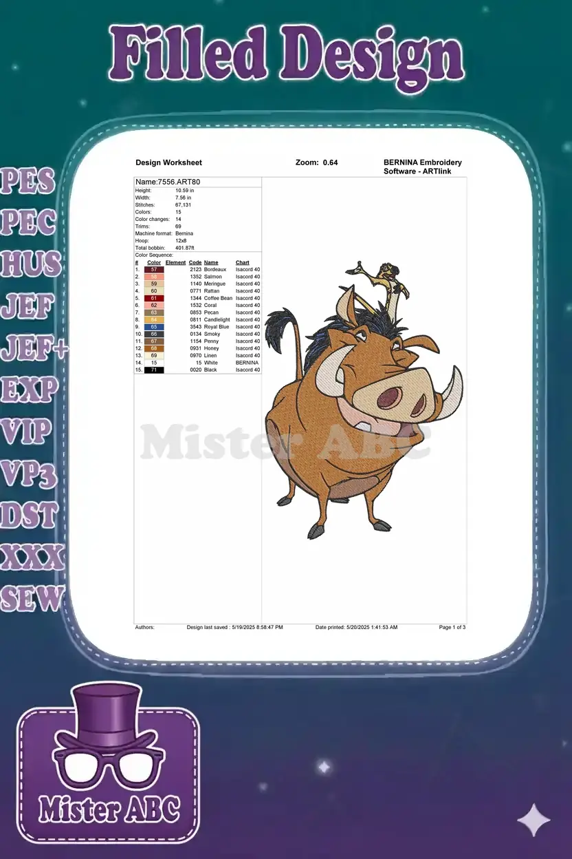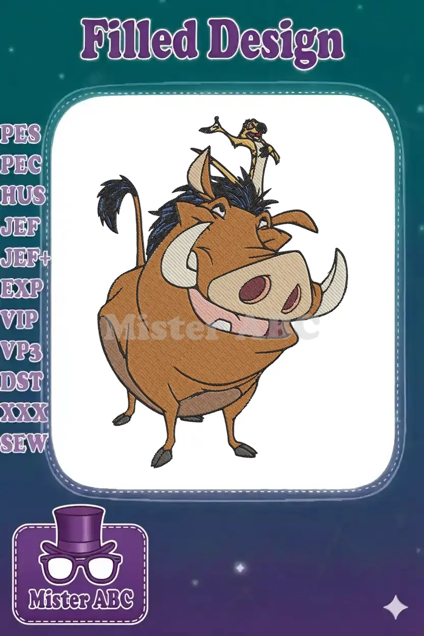 Joyful Pumbaa and Timon Disney Lion King character embroidery designs