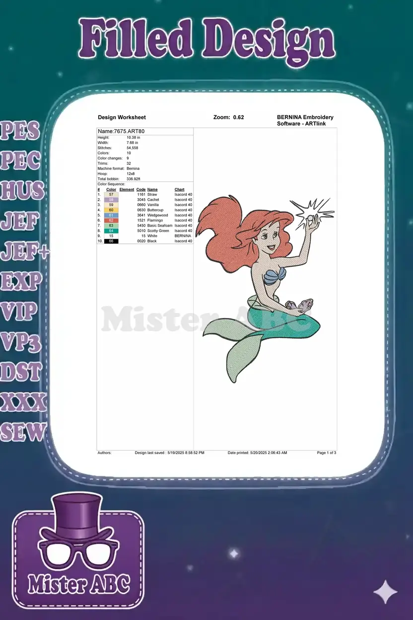 Joyful red-haired Ariel mermaid princess holding pearl embroidery designs