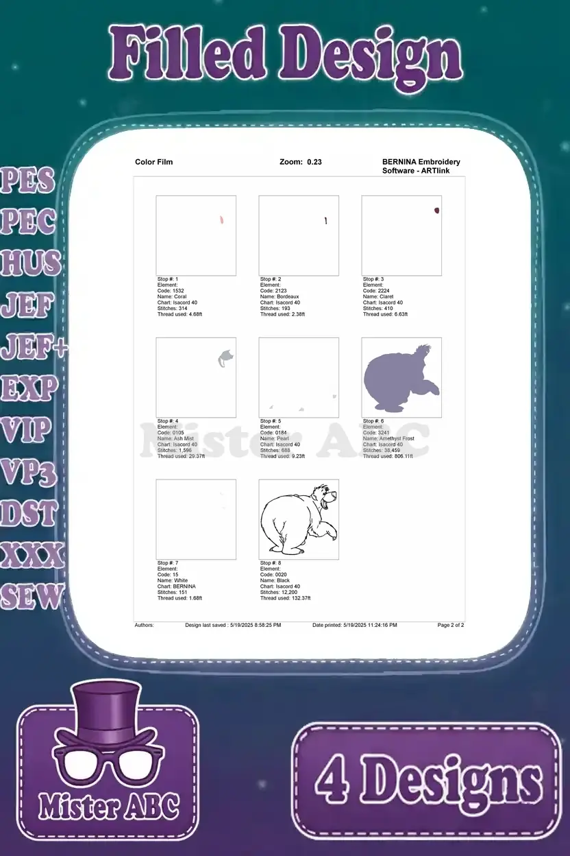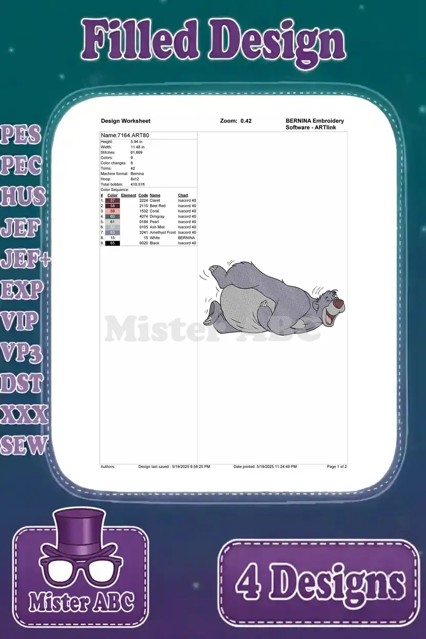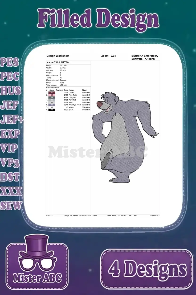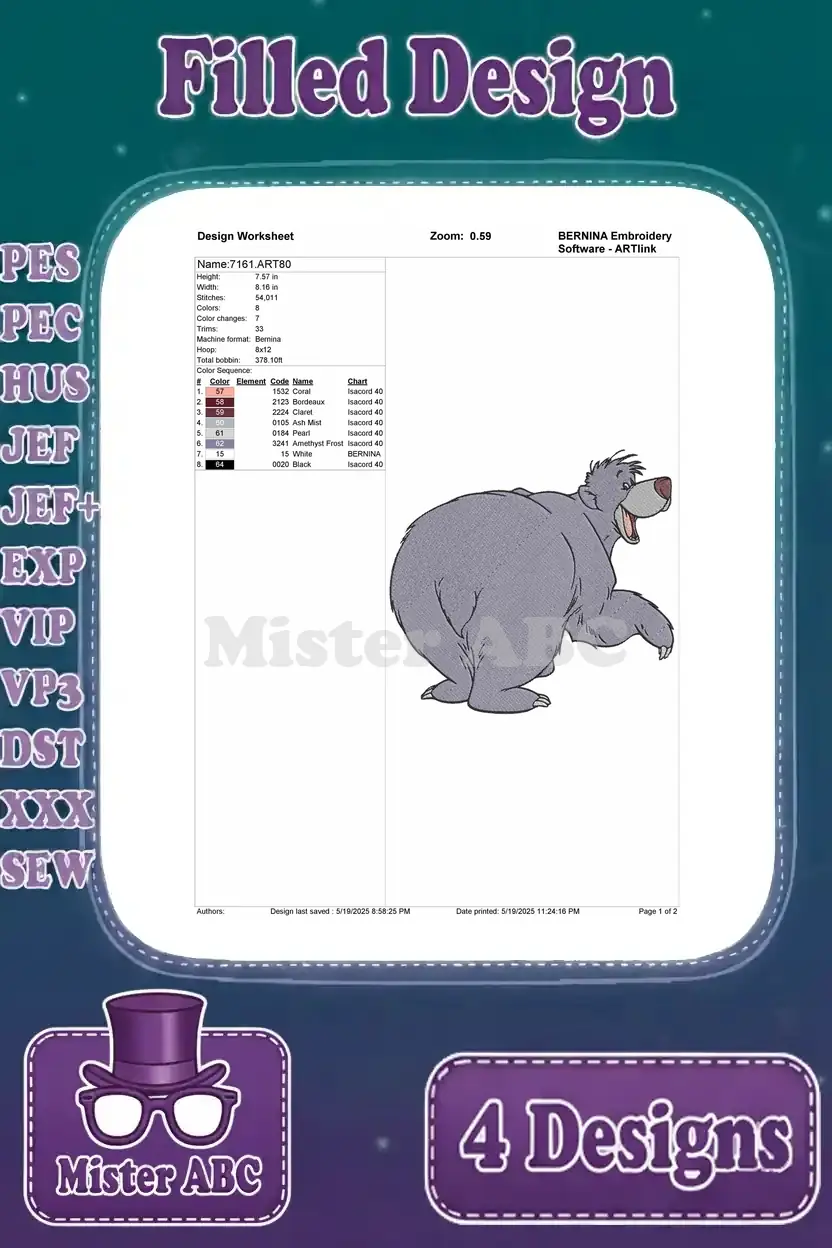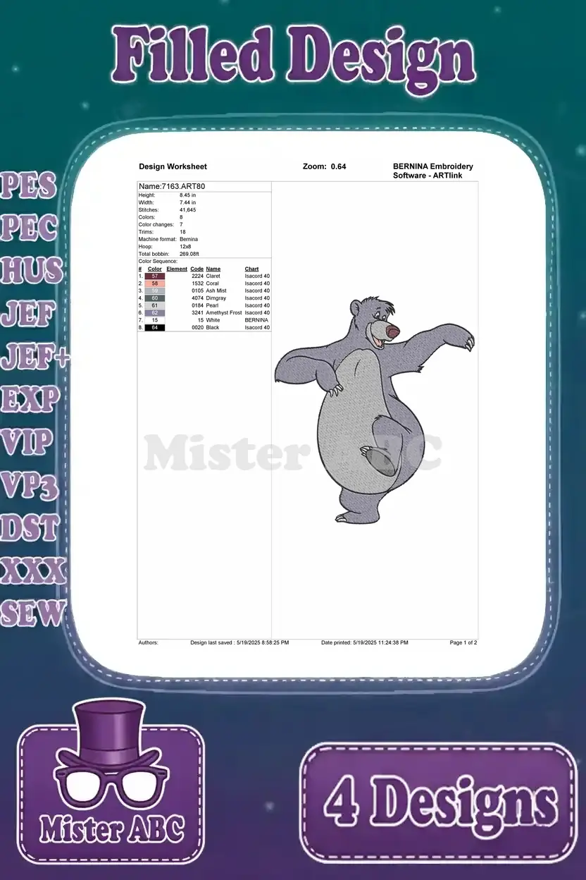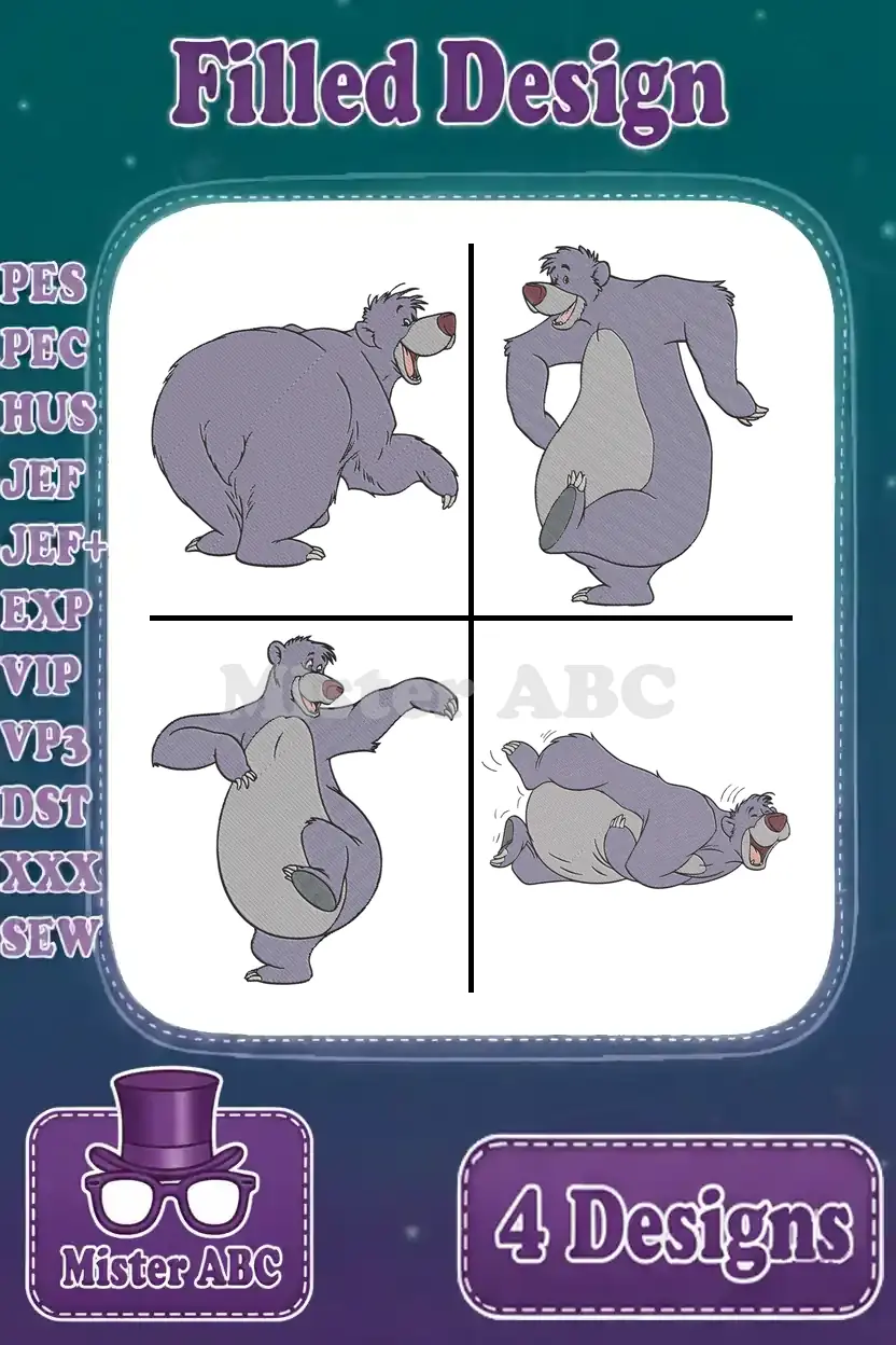 Embrace the jungle spirit with this delightful Baloo embroidery design bundle! Four unique, filled designs bring joy to any project.