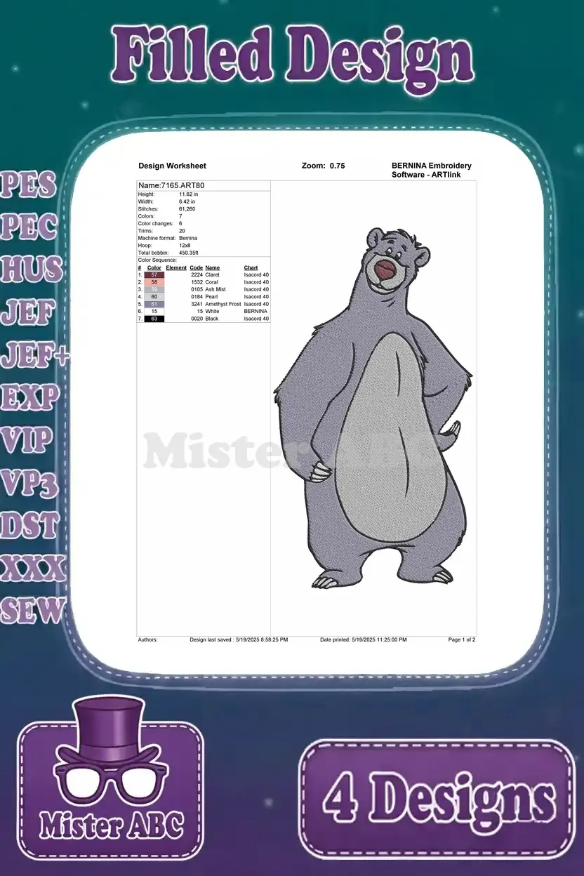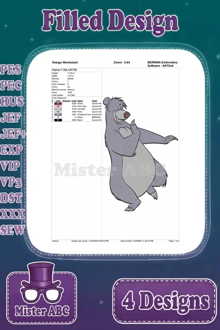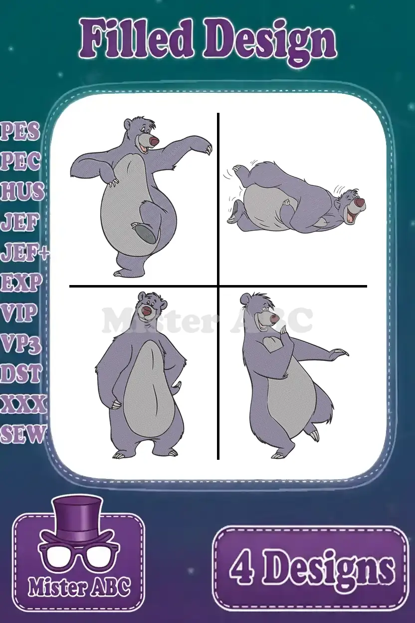 The Jungle Book – Baloo The Bear The Bare Necessities Singer – Dancing Floating And Happy Jungle Life Poses – Filled Embroidery Design