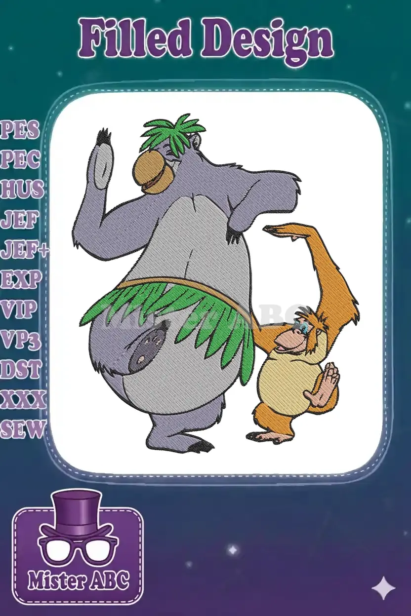 Jungle Book Baloo Bear and King Louie Orangutan dancing embroidery designs
