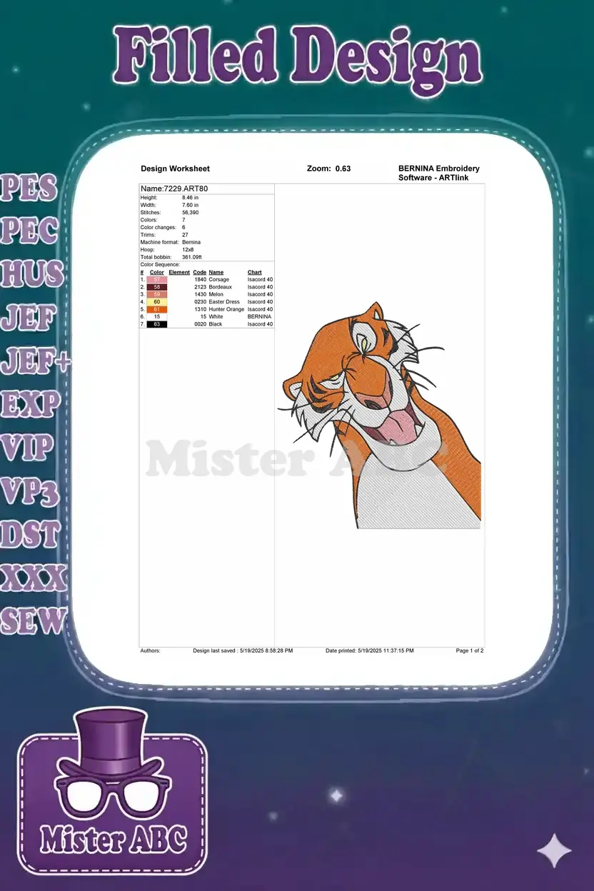 Jungle Book Shere Khan cartoon tiger menacing embroidery designs