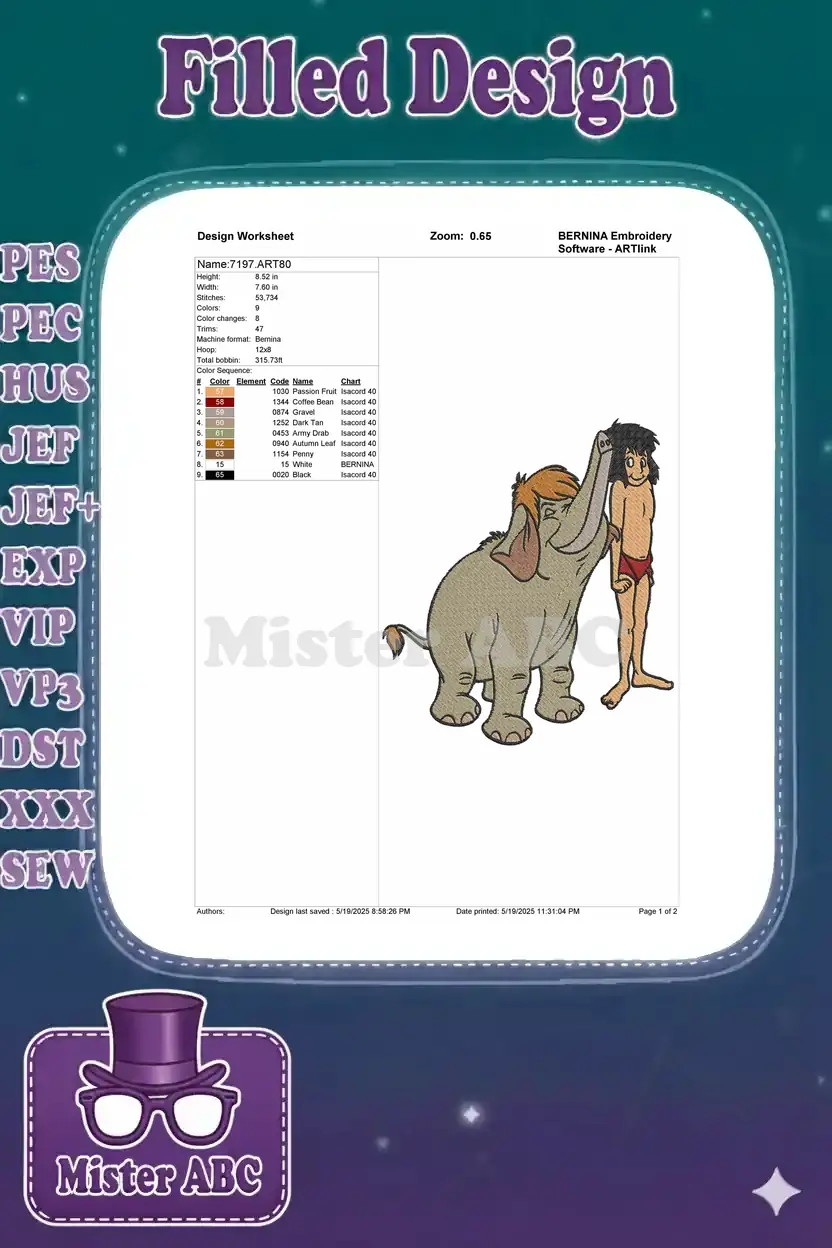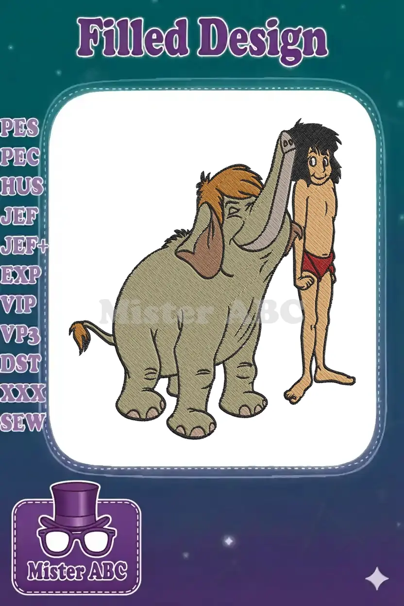 Jungle boy and friendly elephant cartoon character embroidery designs