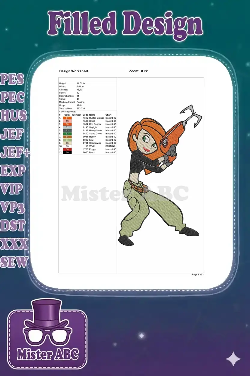 Kim Possible Action Pose Grappling Hook Gun Embroidery Designs