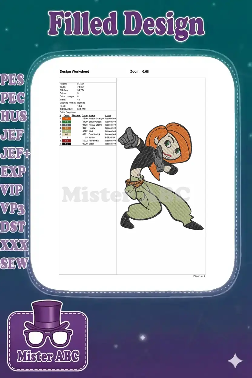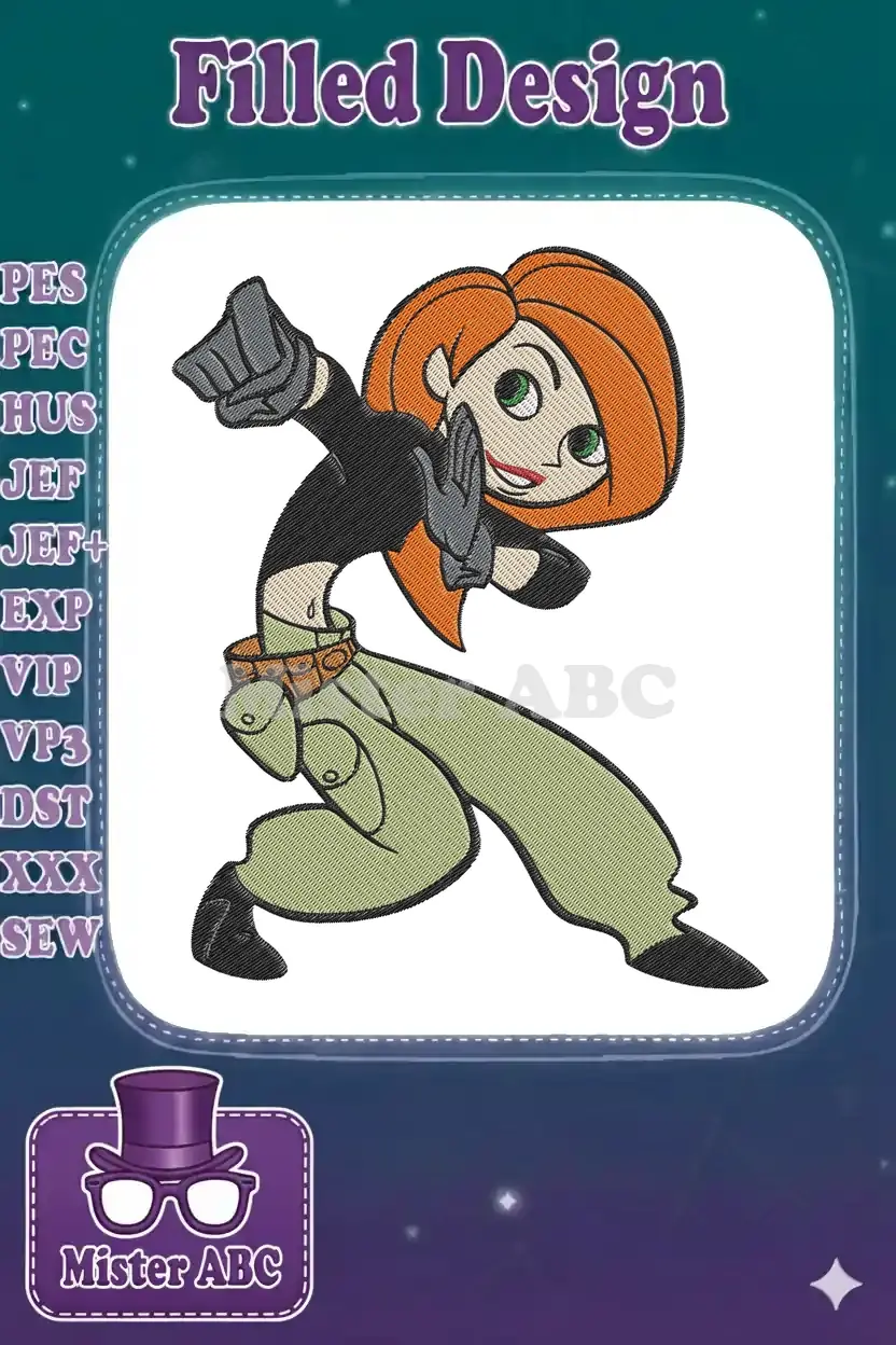 Kim Possible cartoon character dynamic action pose embroidery designs