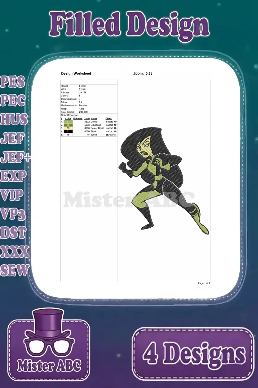 Kim Possible Dr Ann Possible Shego Villain And Kim Possible Action Heroine – Filled Embroidery Design