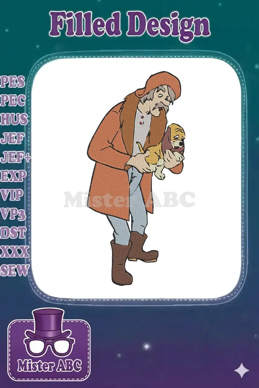 Kind bearded man holding adorable puppy cartoon embroidery designs