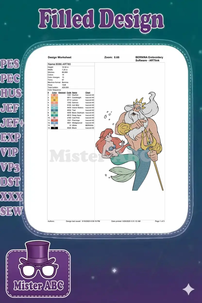 King Triton Ariel The Little Mermaid Disney underwater embroidery designs
