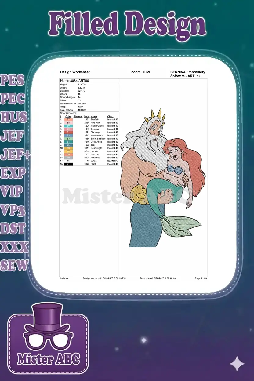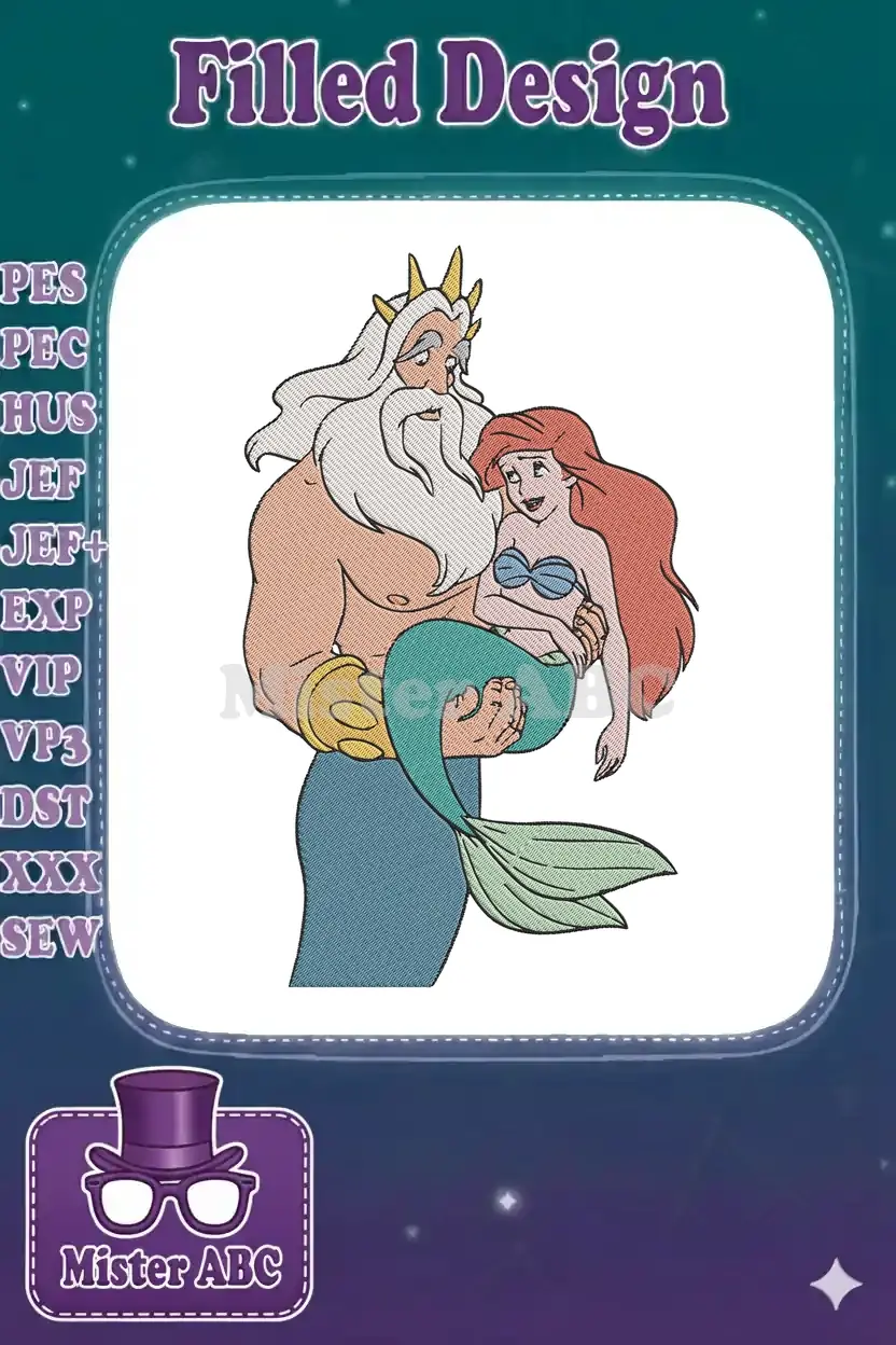 King Triton holding Ariel mermaid father daughter embroidery designs