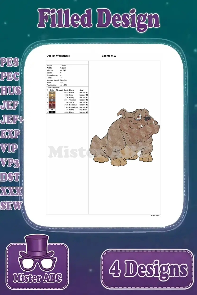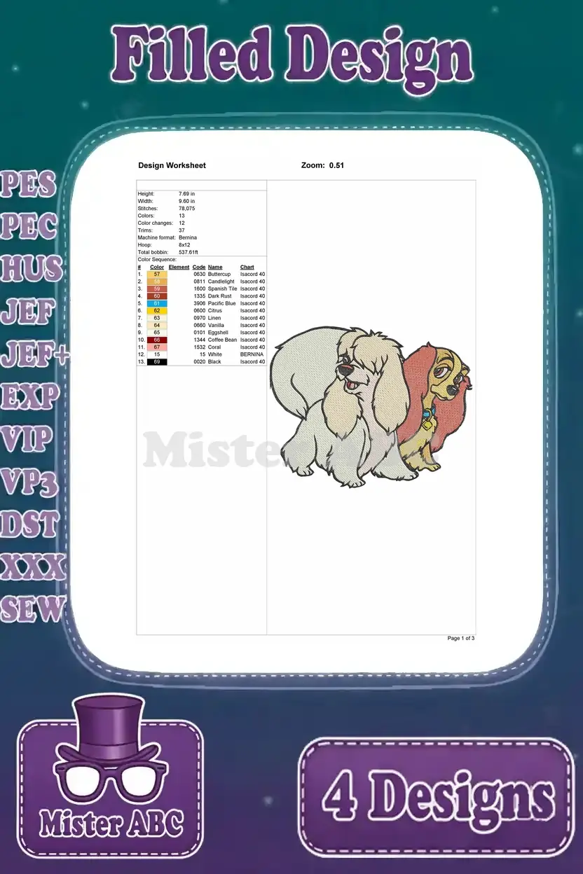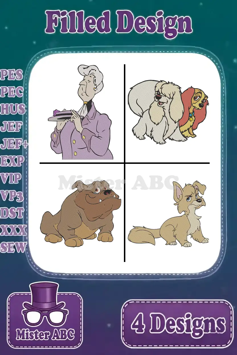 Lady And The Tramp – Aunt Sarah – Peg The Show Dog – Trusty The Bloodhound – Classic Characters – Filled Embroidery Design