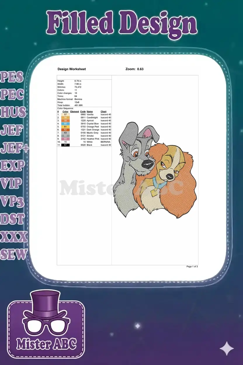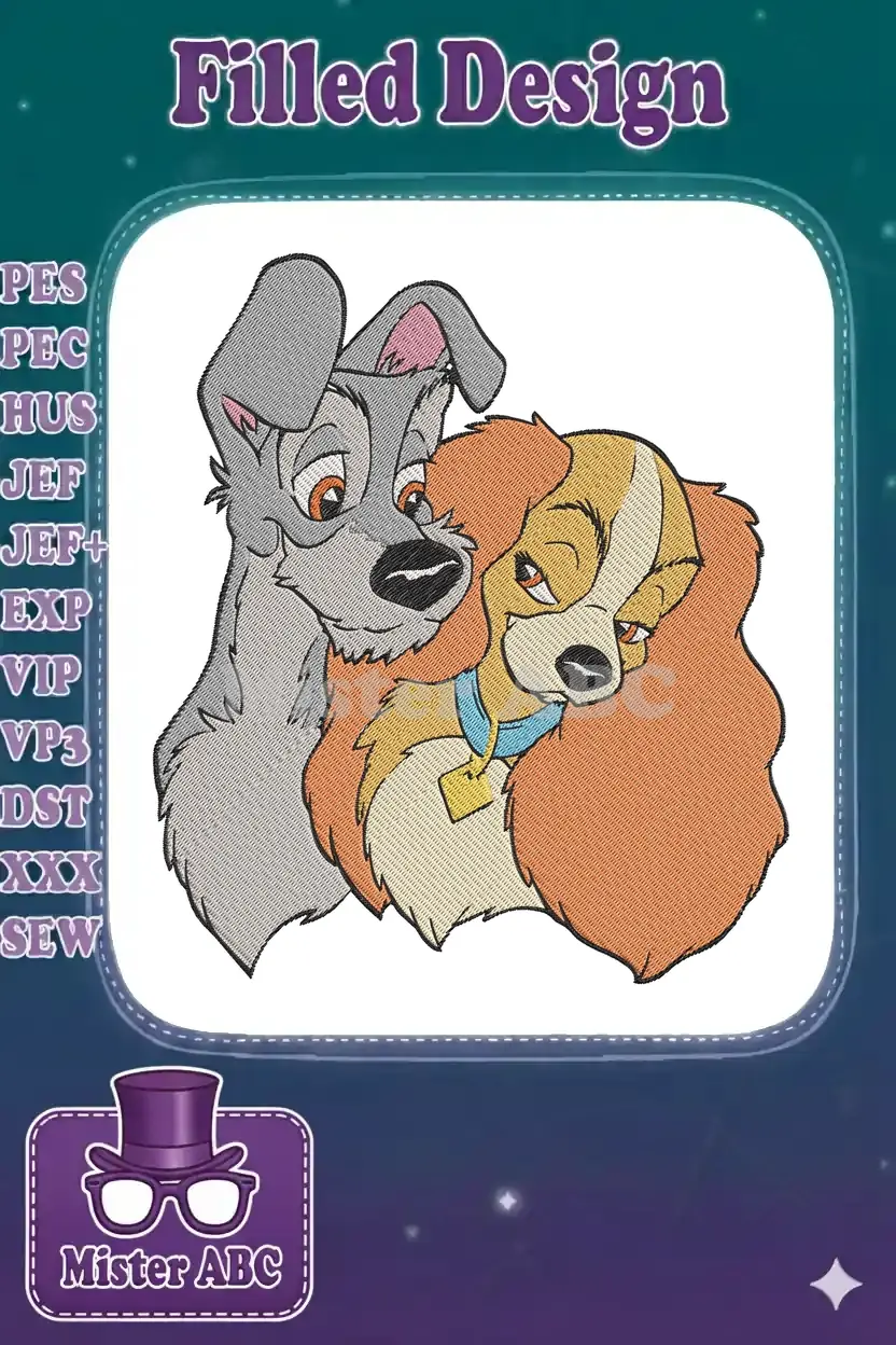 Celebrate timeless love with this enchanting embroidery of Lady and Tramp, perfect for fans of classic animated romance.