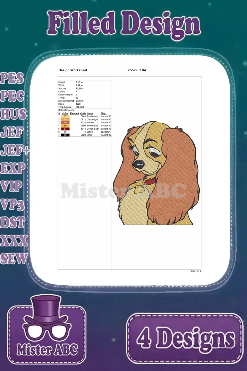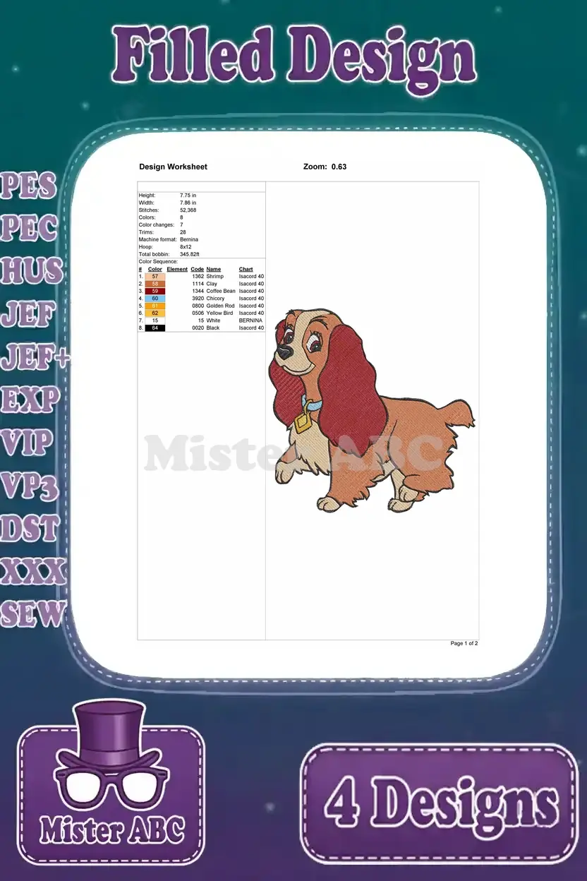 Lady And The Tramp – Lady The Graceful Cocker Spaniel – Multiple Poses – Disney Animation – Filled Embroidery Design