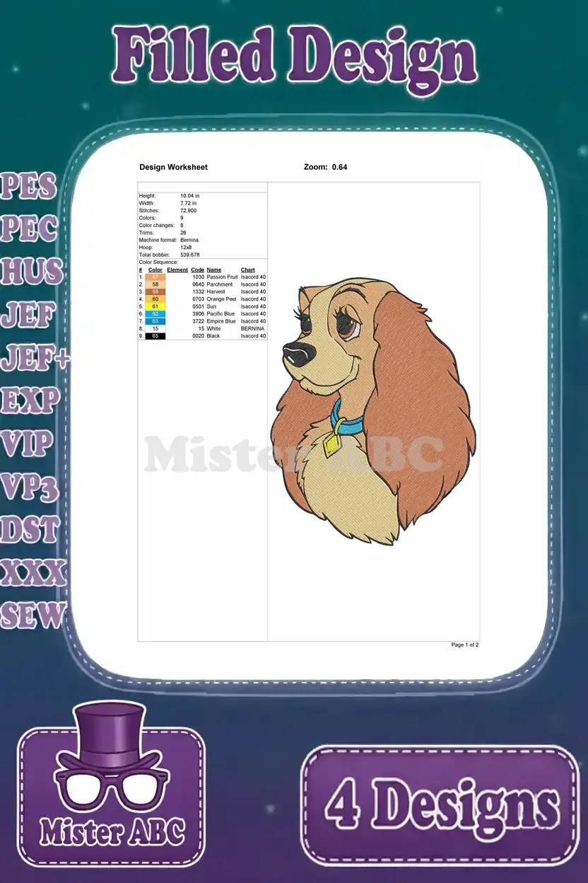 Delightful Lady embroidery design bundle featuring 4 filled designs from Disney’s classic, perfect for any fan!